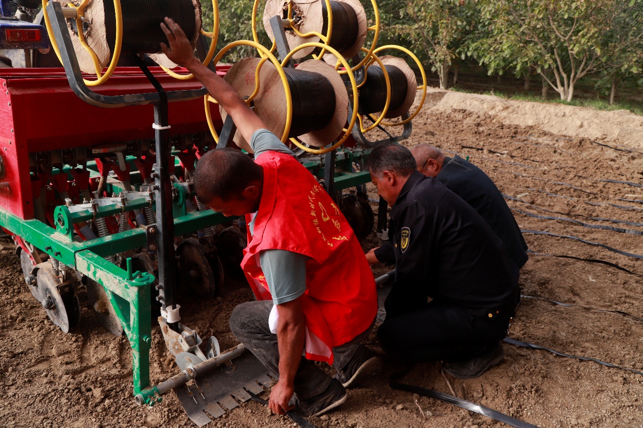 阿热勒镇吐尔拜提喀拉都维村小麦播种现场。(张浩 摄)