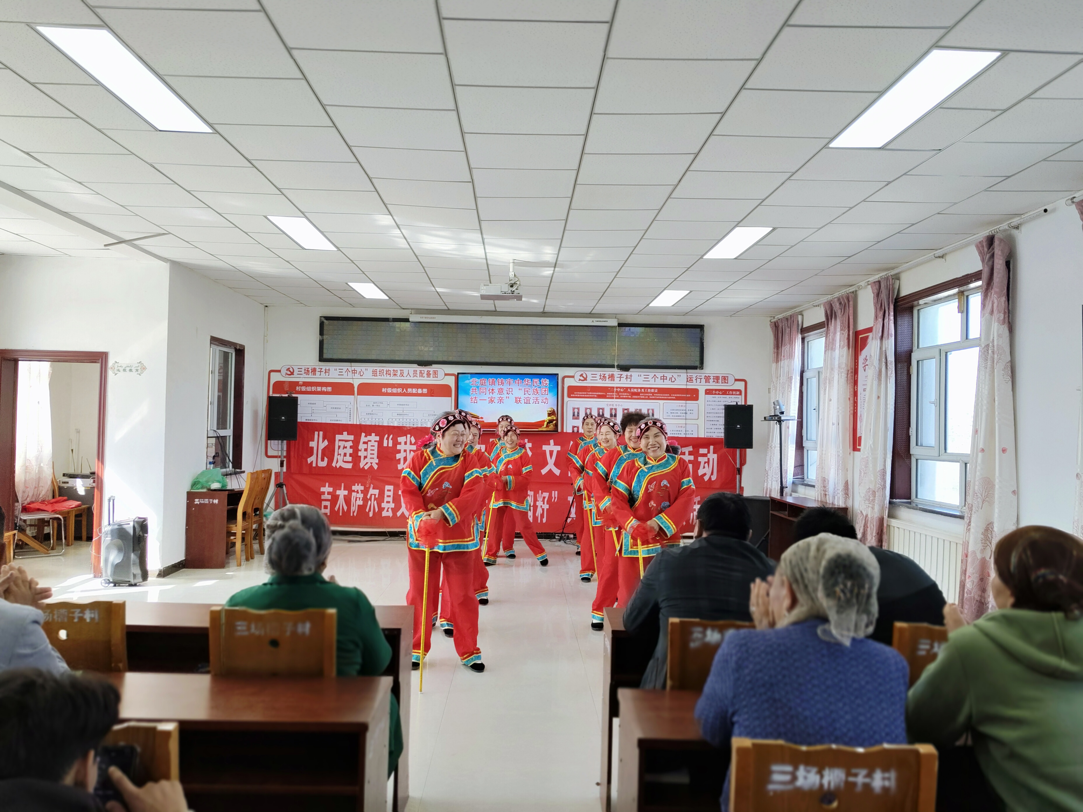 宣讲结束后,北庭镇“石榴籽文艺团队”的精彩表演点燃了现场氛围,《高楼万丈平地起》《农民人真伟大》等节目旋律激昂、内容接地气,赢得阵阵掌声,《二奶奶演员》的生动演绎更是逗得大家笑声不断。
