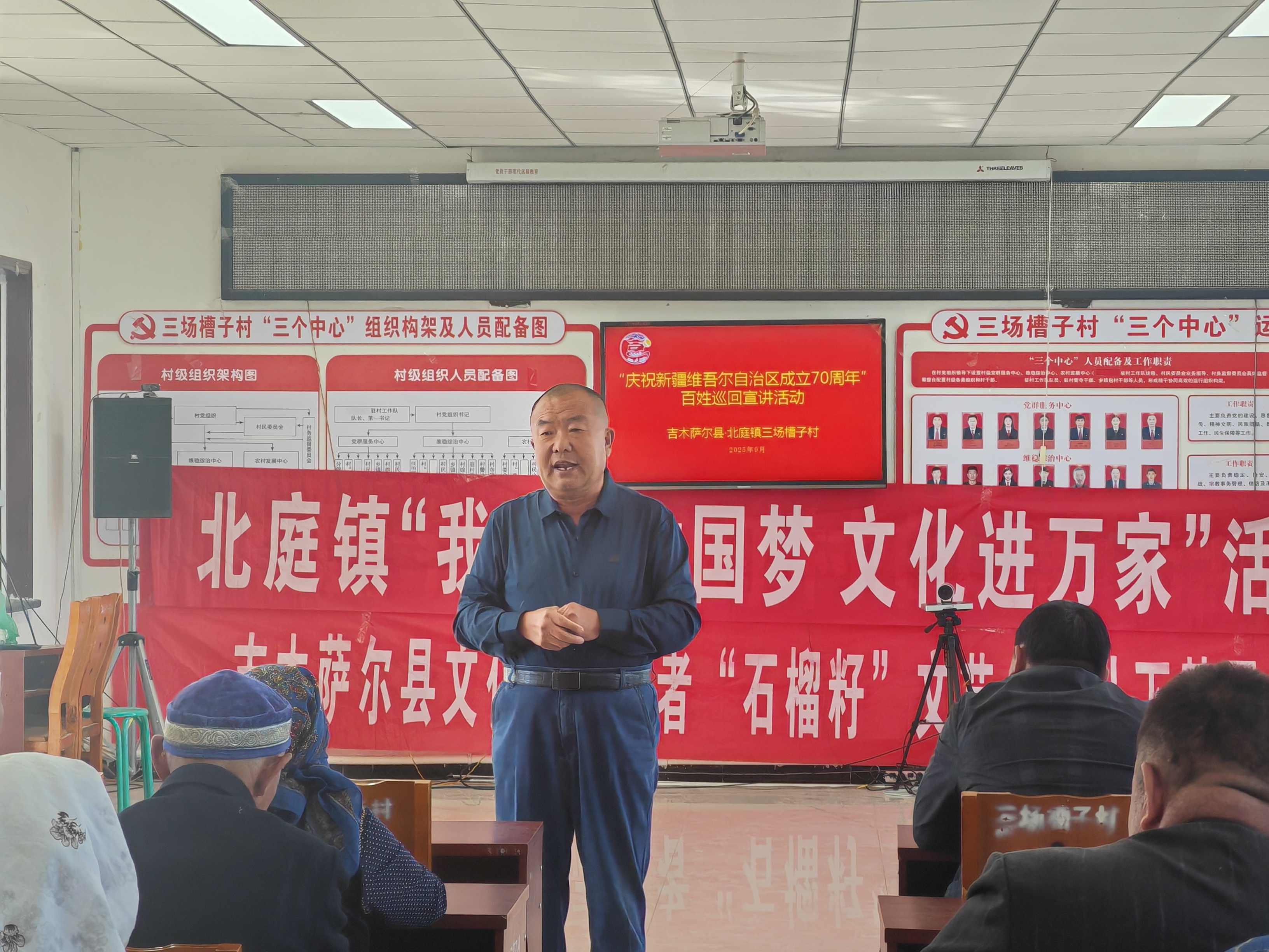 近日,吉木萨尔县委宣传部联合北庭镇在三场槽子牧业新村村开展“庆祝新疆维吾尔自治区成立70周年”百姓巡回宣讲活动,将政策红利、发展变化与文艺节目送到群众身边。该村近70名群众参加了此次活动。