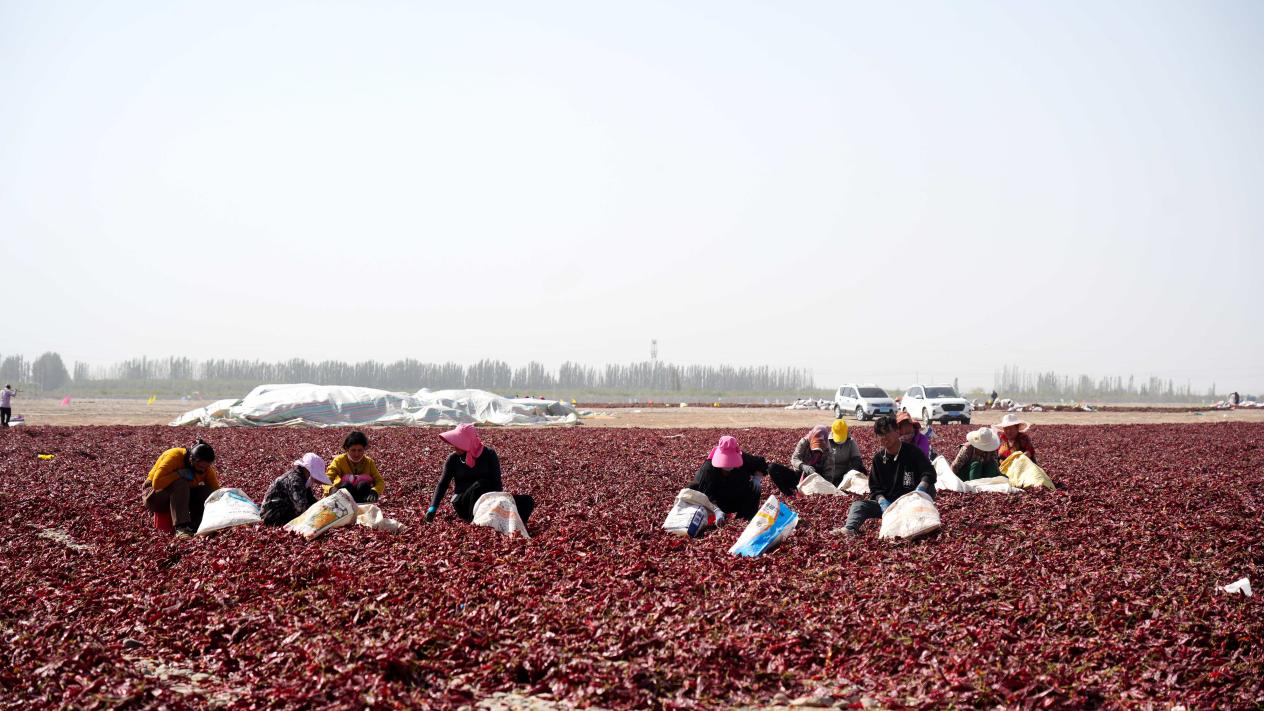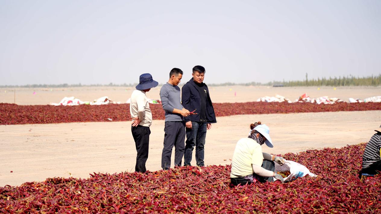 9月25日,温宿县佳木镇辣椒晒场一派繁忙,农户们穿梭其间,忙着翻晒、分拣、装车,指尖划过红椒的脆响与笑语交织;来自各地的采购商手持样品仔细比对,在连片红椒中寻找心仪货源,红火的场景里满是生机。