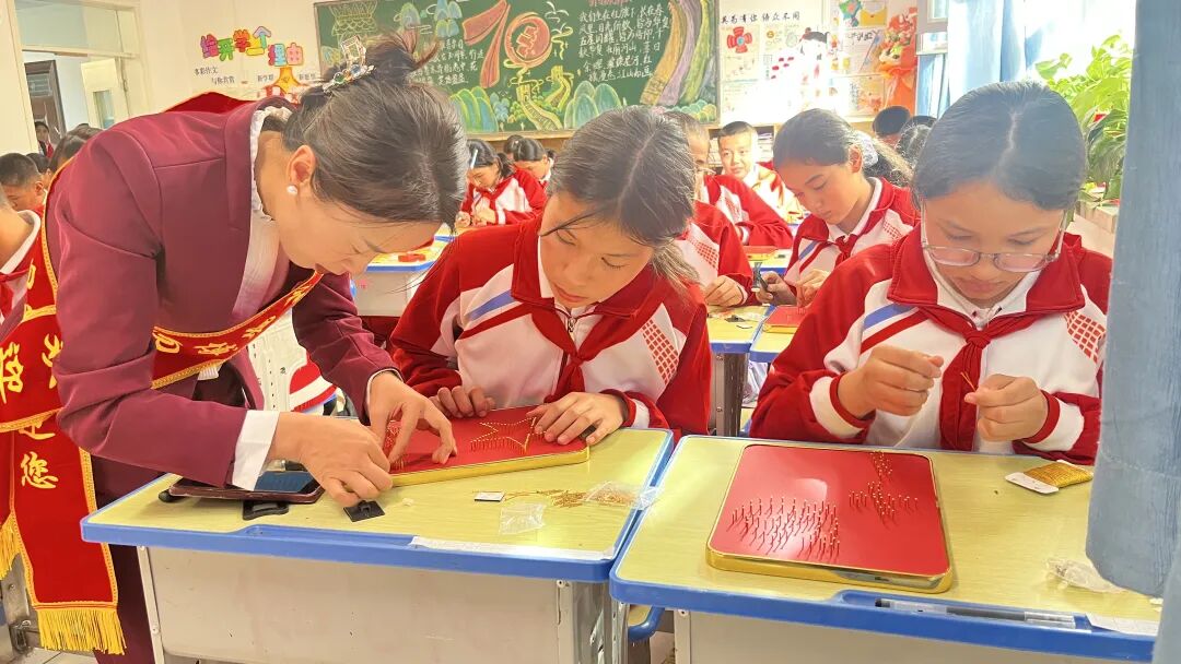 随后,以“钉筑热爱・画映初心”为题的钉子画制作活动有序展开。工作人员首先详细讲解了创作原理和安全规范,展示了以“国旗+天安门”为核心的模板,引导学生如何在作品中融入自己对祖国和家乡的热爱之情。接着,工作人员为学生们分发了材料包,并耐心指导他们从确定钉子位置、控制锤子力度,到用彩色线绳勾勒图案的每一个步骤,学生们专注投入,小心翼翼地将对祖国的热爱之情“钉”进木板、“织”进画面。整个制作过程不仅锻炼了学生的动手能力,更让他们在亲身实践中深化了爱国情感。一幅幅色彩鲜艳、充满心意的钉子画,成为了学生们表达爱国初心的生动载体。