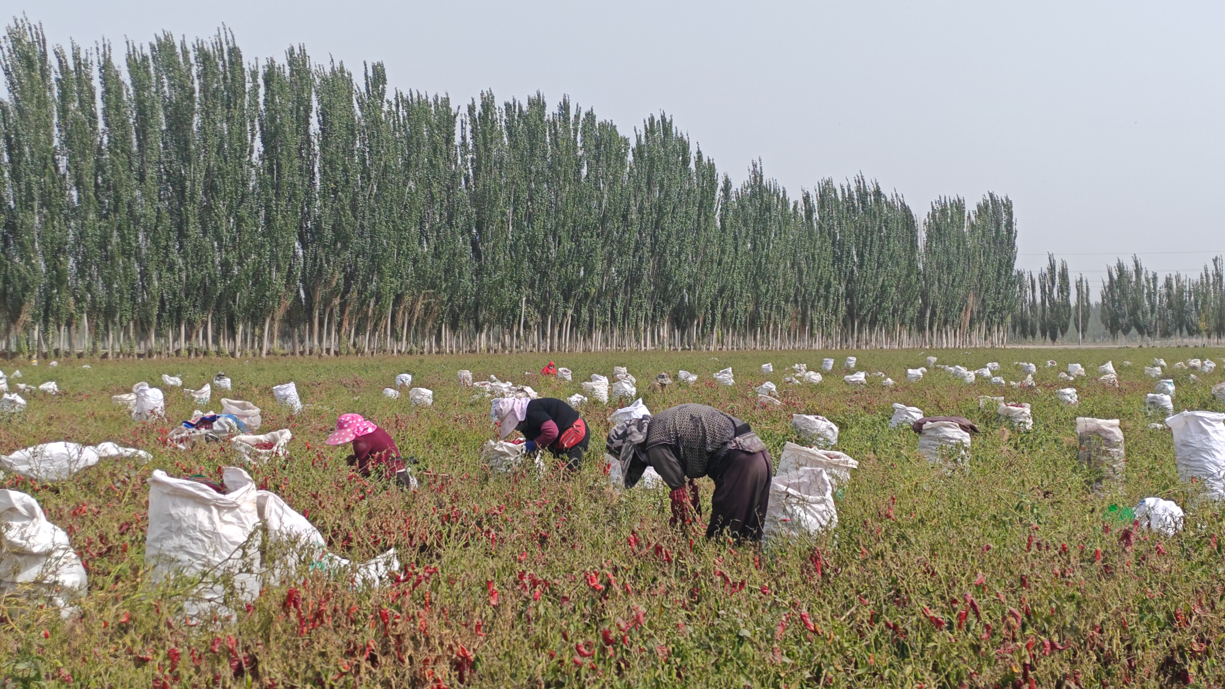 今年,十一连因地制宜推广辣椒套种孜然模式,共种植辣椒1.2万亩,既提升了土地利用率,也为产量打下基础。不同于机械采收,这里的辣椒全程采用人工采收。十一连党支部副书记、连长葛凯解释道:“我们卖的都是鲜椒,人工采收能最大程度保证品质,破损率远低于机械采收,也更受收购商青睐。”