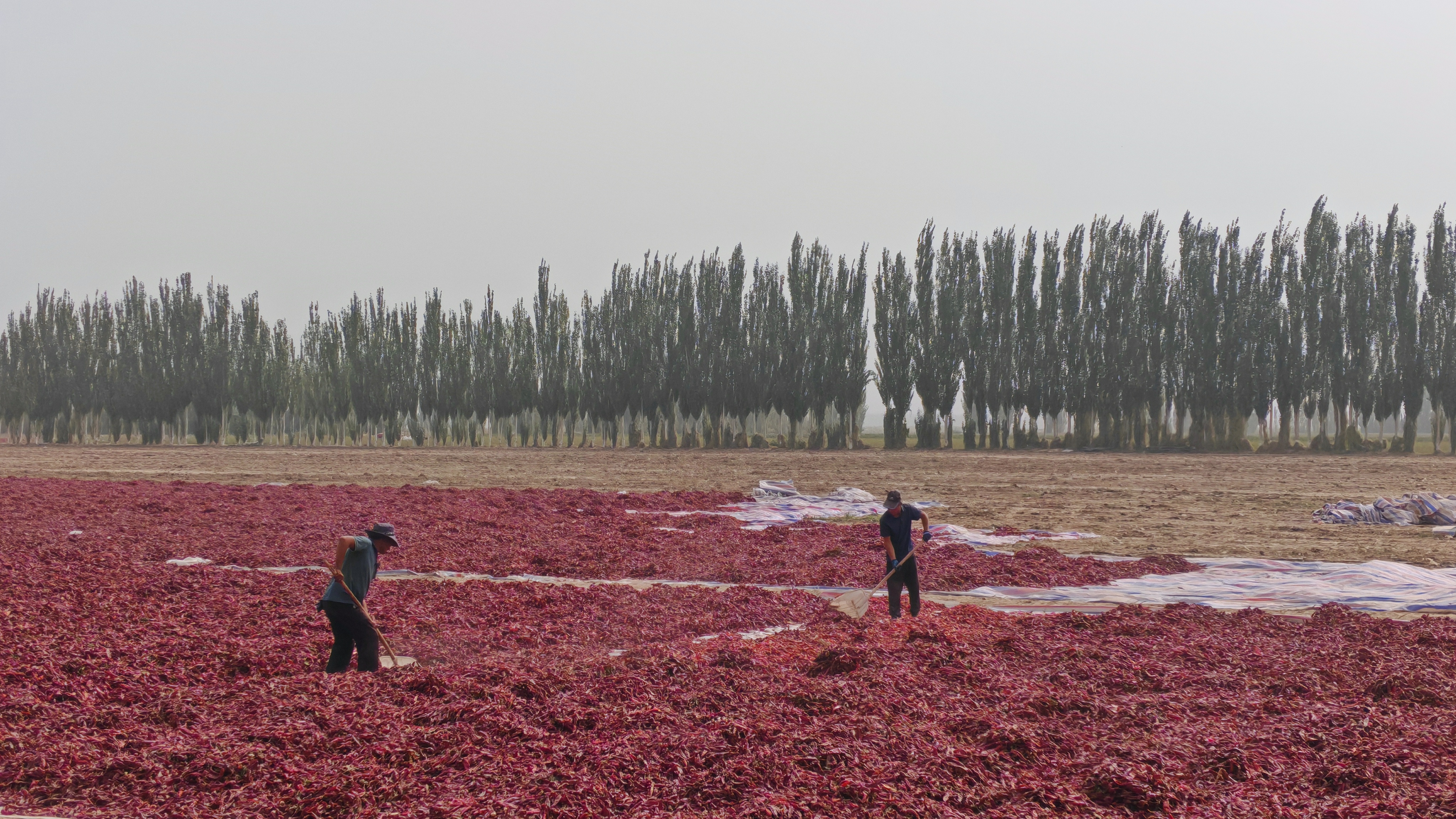 八团塔门镇的万亩椒田迎来丰收好景。图为工人正在晾晒辣椒。曾维 摄
