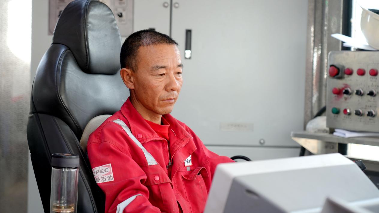 10月1日,在阿克苏油田温29-1-H16井站,司钻轻点按钮操控“金鹏”智能钻机进行钻井作业 (赵新昌 摄)