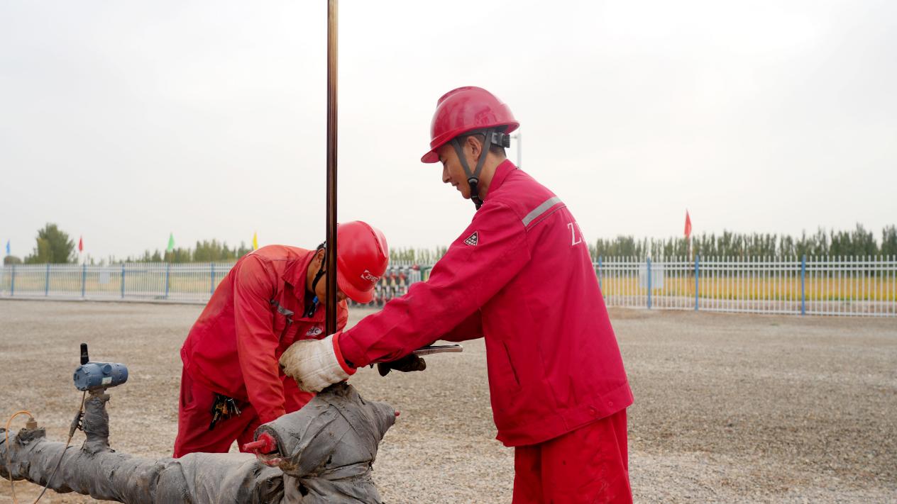 10月1日,阿克苏中曼油气勘探开发有限公司采油管理区巡护班员工在巡检维护采油设备 (赵新昌 摄)
