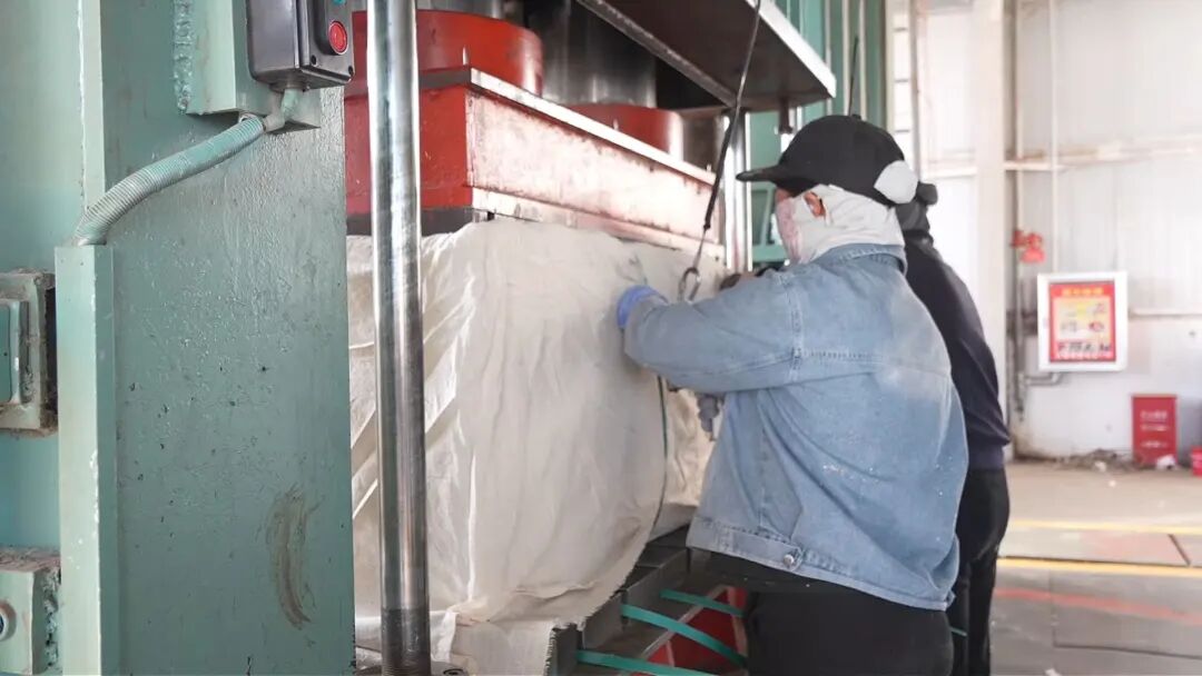 在沙湾市宏基农业发展有限公司棉花加工厂,工人正在打包皮棉。 马文静摄