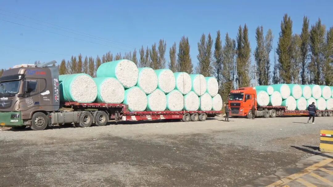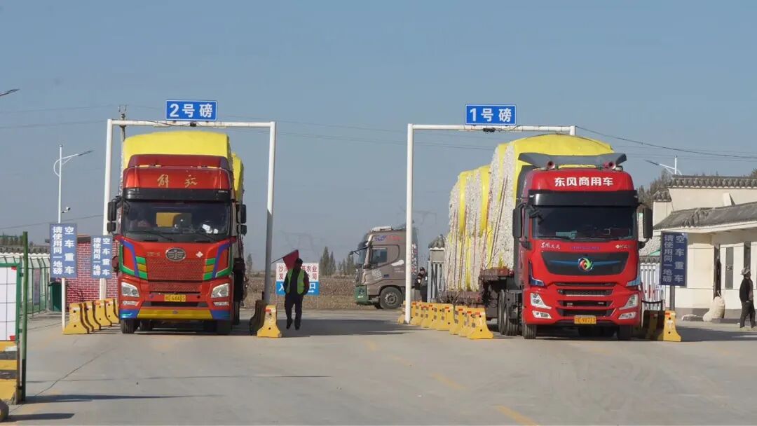 在沙湾棉花产业有限责任公司优质棉分公司,同样是一片忙碌景象。运棉车排队过磅、卸棉,工作人员正协助棉农办理收购、结算手续。