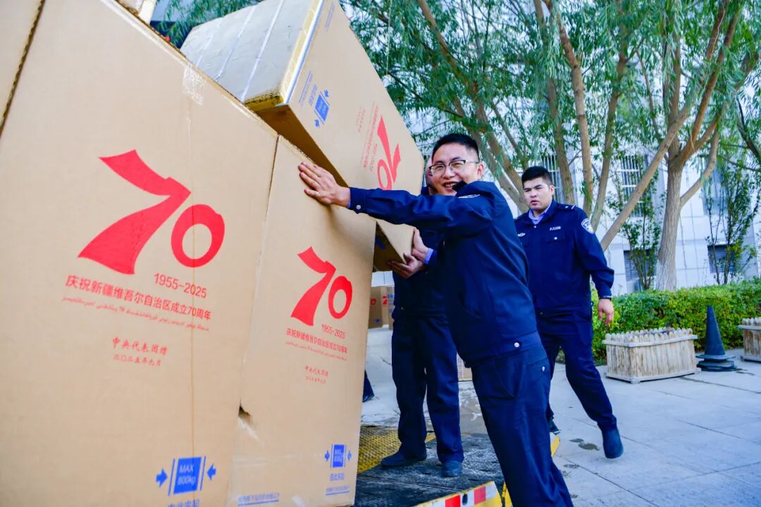 在新疆维吾尔自治区成立70周年的喜庆氛围中,10月10日,新和县公安局收到了来自中央代表团的暖心纪念品,一份份承载着关怀的洗衣机、微波炉等实用设备陆续配发至基层警务站点,让警营内外涌动着融融暖意。
