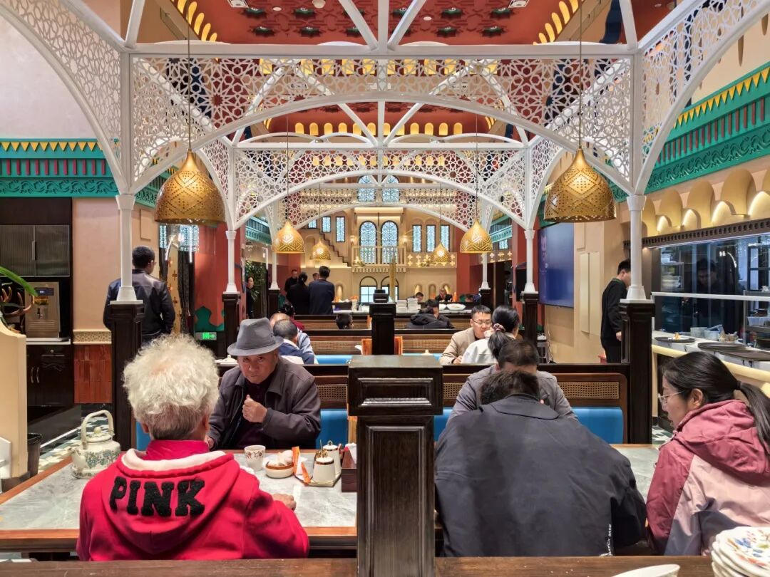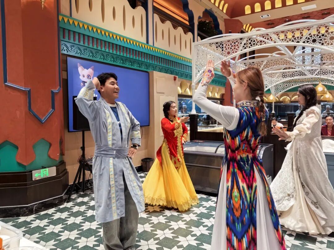 10月15日14时,可克达拉市盛世楼兰烤包子餐厅内已经香气四溢,座无虚席。食客们一边品尝着金黄酥脆的烤包子、香气扑鼻的抓饭等新疆特色美食,一边欣赏着热情奔放的新疆舞蹈,享受着味觉与视觉的双重盛宴。餐厅内独特的西域风格装修,让每一位顾客仿佛置身于丝路古城,感受到浓郁的新疆文化氛围。