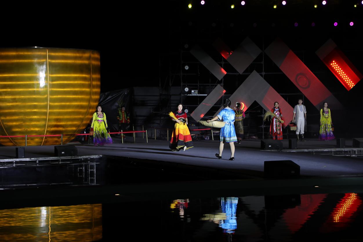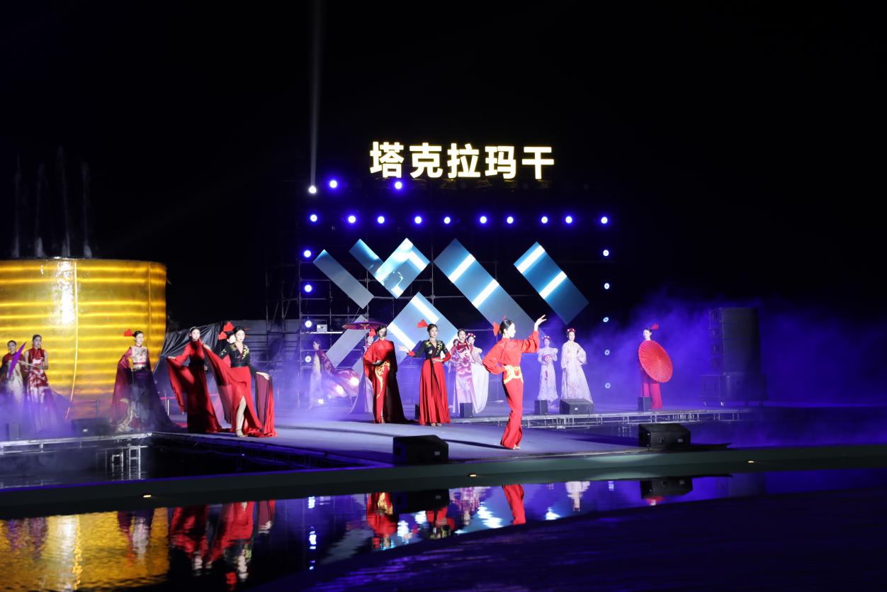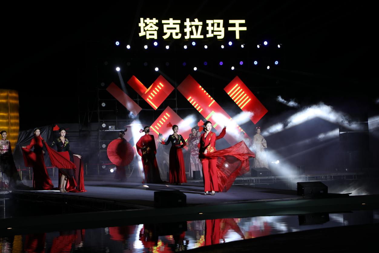 T台秀现场,模特们身着融合丝路文化元素与现代设计理念的服饰依次登台,为观众带来沉浸式沙漠夜文化体验。胡彩艳 摄