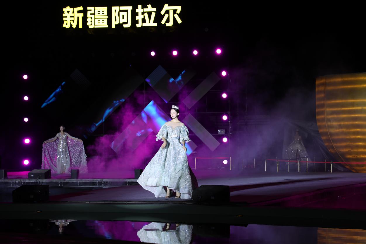 夜幕下的沙漠T台独具风情,各团镇与高校队伍的模特身着融合丝路文化元素与现代设计理念的服饰依次登台。这些服饰或采用沙漠驼绒等本土特色材质,或巧妙植入兵团屯垦文化符号,胡杨纹理、沙漠星空等地域元素的创意呈现,将阿拉尔的历史底蕴与时尚活力展现得淋漓尽致。“把沙漠的故事穿在身上,这种设计太有感染力了!”游客王婧举着手机全程拍摄,言语间满是赞叹,现场欢呼声与掌声此起彼伏,为沙漠夜色增添了动人活力。