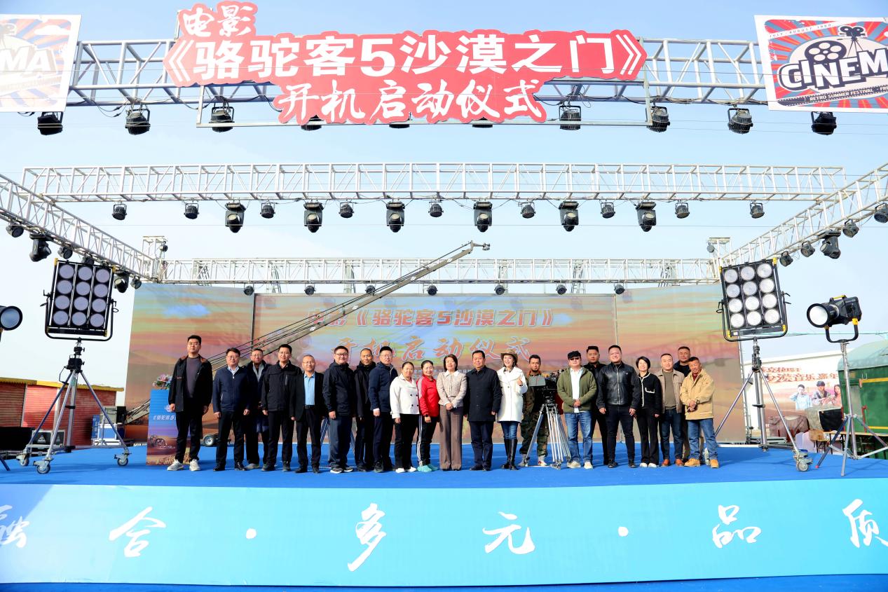 电影《骆驼客5·沙漠之门》开机仪式现场,出席活动的嘉宾及剧组人员合影留念。王芳芳 摄