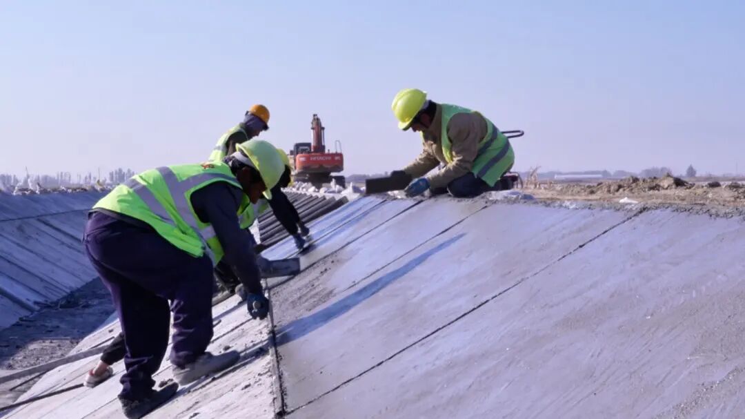 近日,在海子湾引水渠道改造工程(二期)建设现场,一派火热的施工景象。机械与人员协同配合、高效作业,有条不紊推进边坡修整、混凝土浇筑与板面收光等关键工序,全力向工程建设目标冲刺。
