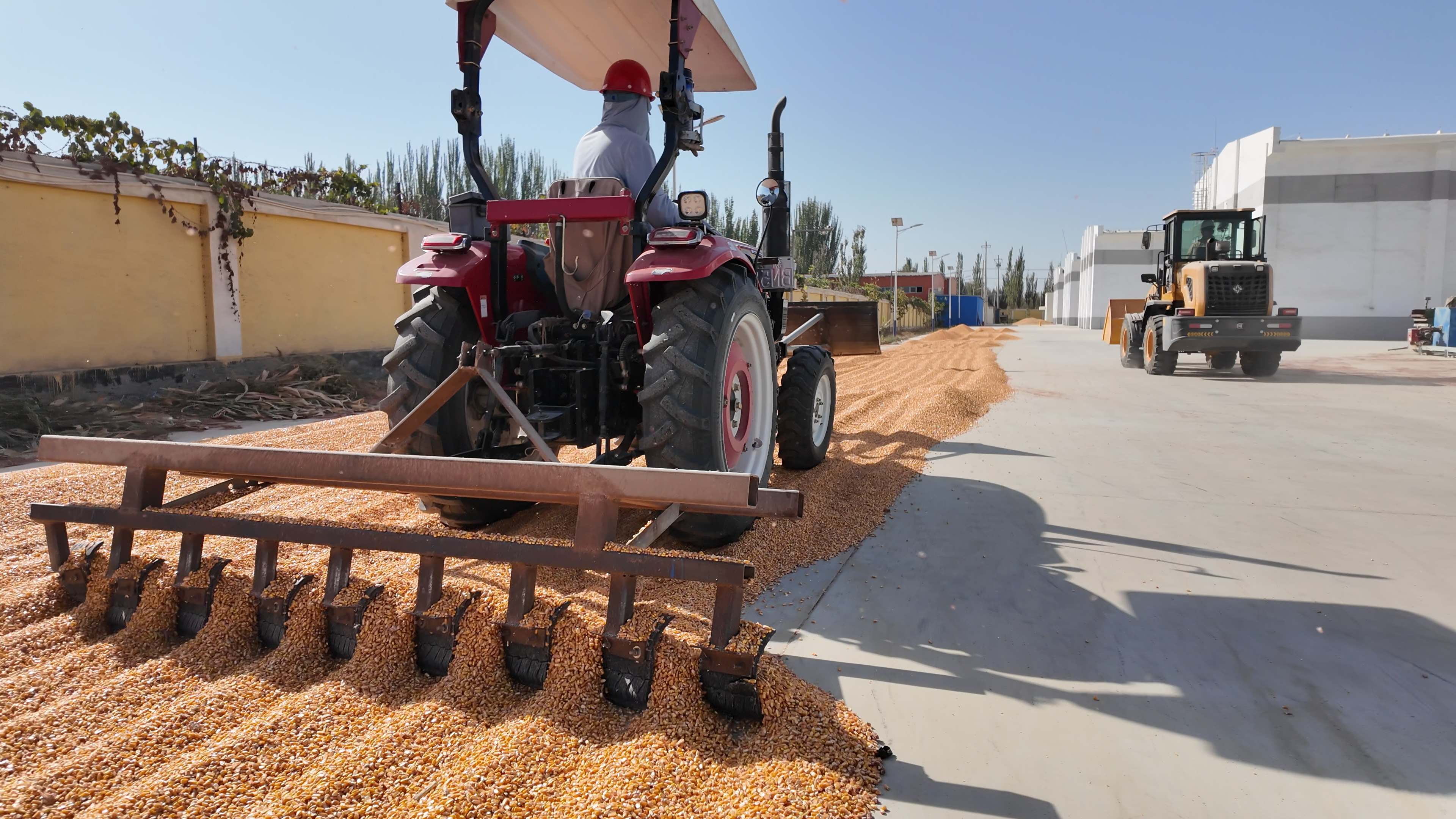 在粮库院子内,墨玉县鑫禾家庭农场合作社的老板金成龙正在晾晒自家玉米。今年,他在奎牙镇种了3000余亩的玉米,整体产量可观,百亩亩产可达800余公斤,千亩亩产可达750公斤左右。目前他们家玉米已经收割40%,还有60%左右正在抢抓天气抢收。
