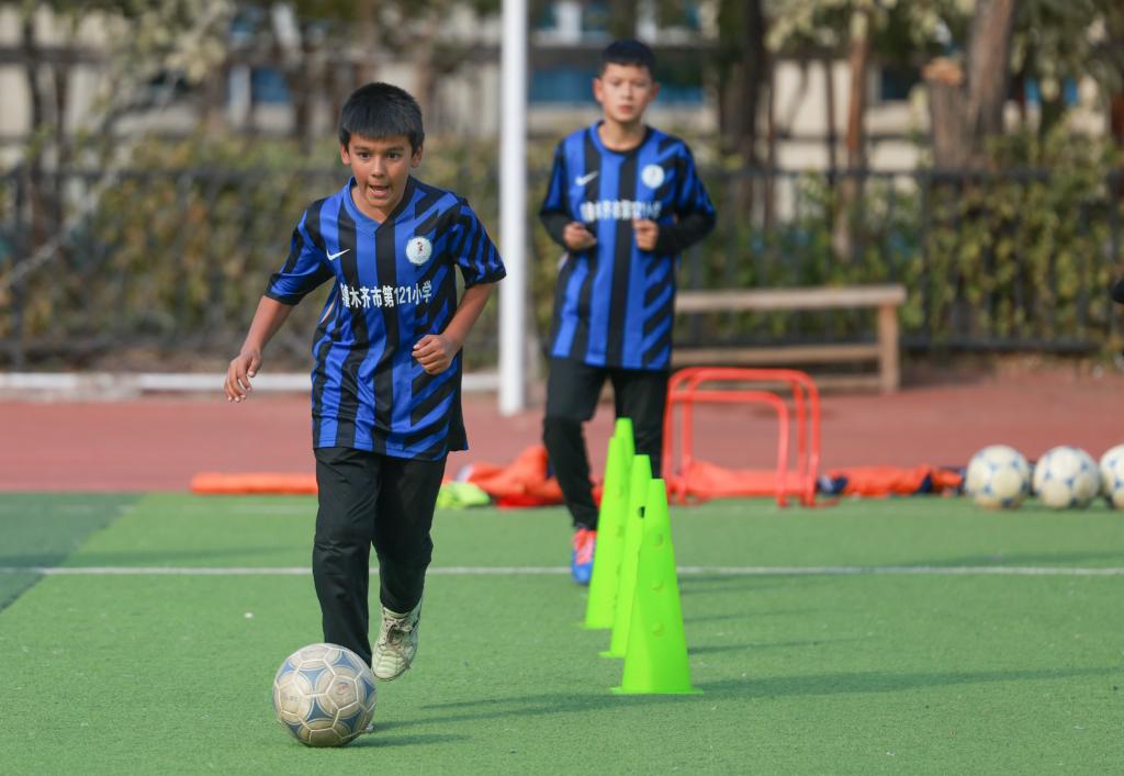 在众多体育项目中,121小学选择了足球。学校成立第二年,“小骏马”校园足球队就初具雏形。李磊说,选择足球有两点原因,一是长期以来,新疆各族群众广泛参与足球运动,氛围浓厚,“大人小孩踢、大街小巷踢、一年四季踢,不少孩子打记事起就已爱上足球。”