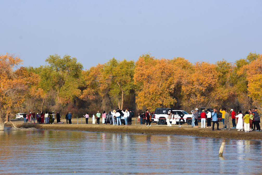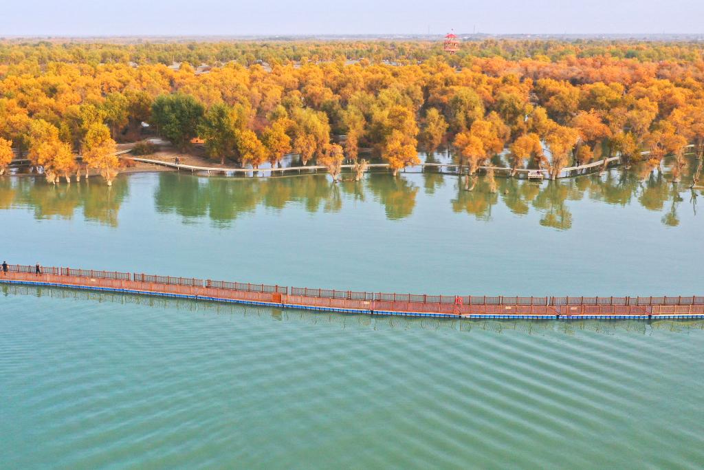 10月22日,游客在新疆阿克苏地区沙雅县沙雁洲景区内的胡杨林中游览。新华社记者 贺小童 摄