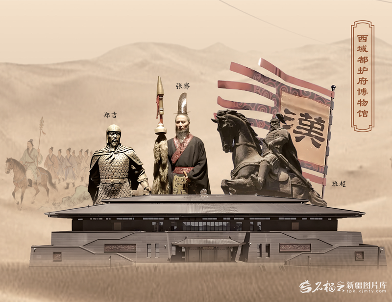 博物馆位于轮台县,于今年5月18日正式开馆。博物馆以“悬旌万里”为主题,设“都护建府”“令行西域”等5个常设展区,集中陈列463件(套)文物,展示了轮台县境内卓尔库特古城遗址、奎玉克协海尔古城遗址及周边文化遗址近年来的重要考古成果,以及出土于新疆各地反映历代中央政权有效治理西域的重要文物。图中人物分别为首任西域都护郑吉、凿空西域的博望侯张骞、东汉时期两度出使西域的班超。