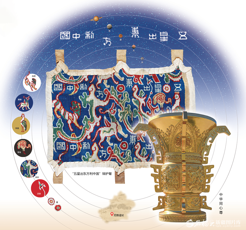 “‘五星锦’的图案有凤凰、鸾鸟、麒麟、白虎等祥禽瑞兽,还有祥云瑞草,‘五星出东方利中国’文字巧妙地织在其中,寓意祈佑祥瑞。织锦护臂成为随葬品,折射出西域各地对中华文化的推崇与认同。”新疆文物考古研究所研究员吴勇说。