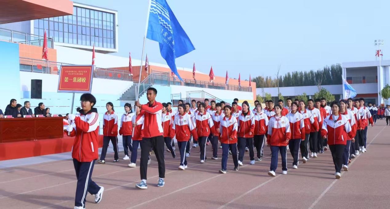 各学校代表队身着特色服装,步伐矫健,手持校徽与标语,以昂扬姿态走过主席台,脸上洋溢着自信的笑容,充分展示了本校学子的精神风貌。