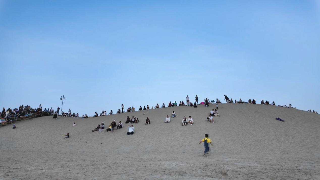 连绵起伏的沙丘上,游客在欣赏日落。潘许 摄