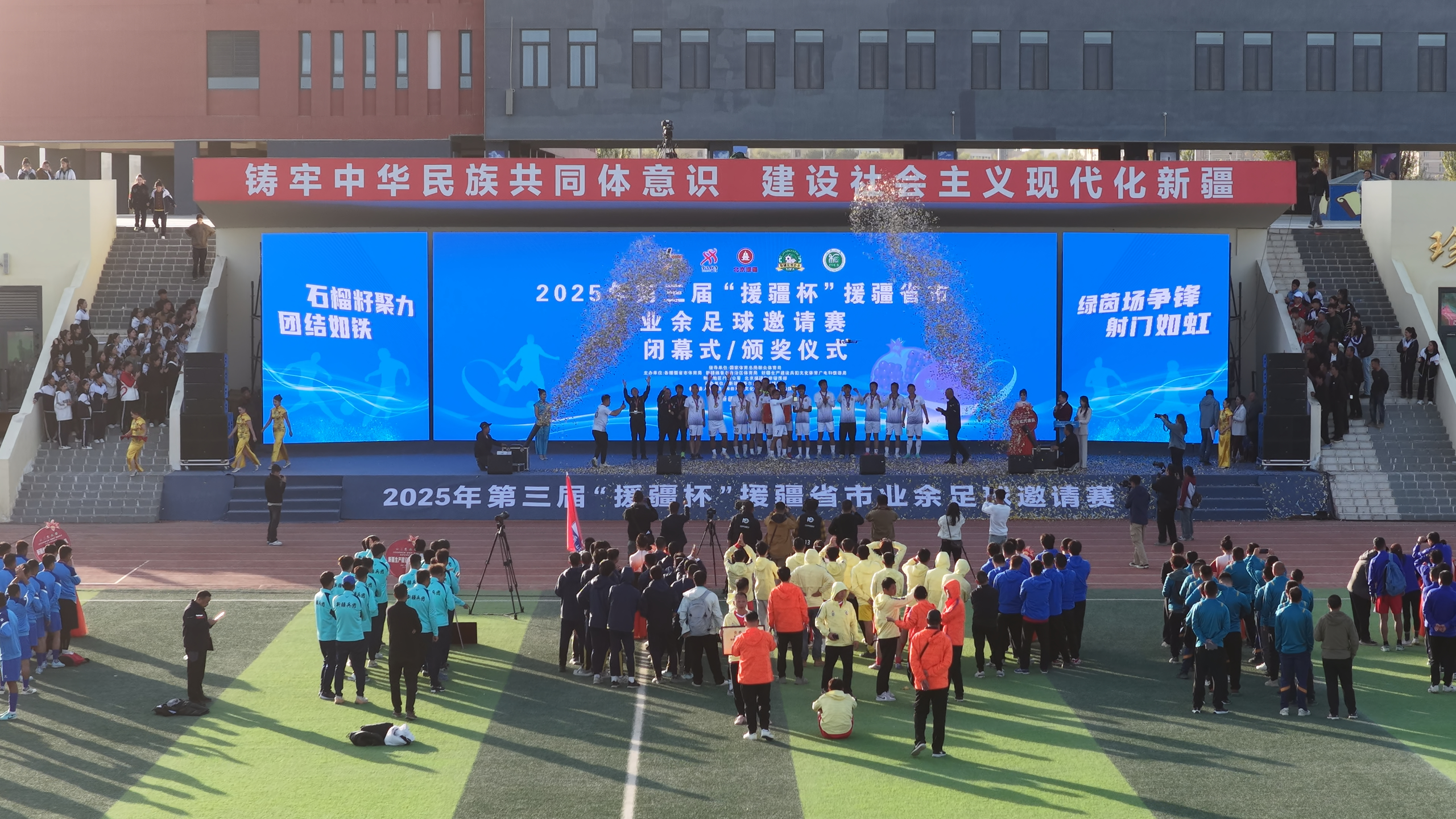 10月27日下午,随着冠亚军争夺战终场哨声响起,为期七天的2025年第三届“援疆杯”援疆省市业余足球邀请赛在墨玉县圆满落幕。山东省代表队在决赛中以1:0战胜新疆维吾尔自治区代表队,摘得本届赛事桂冠,新疆维吾尔自治区代表队获得亚军,北京队位列季军。