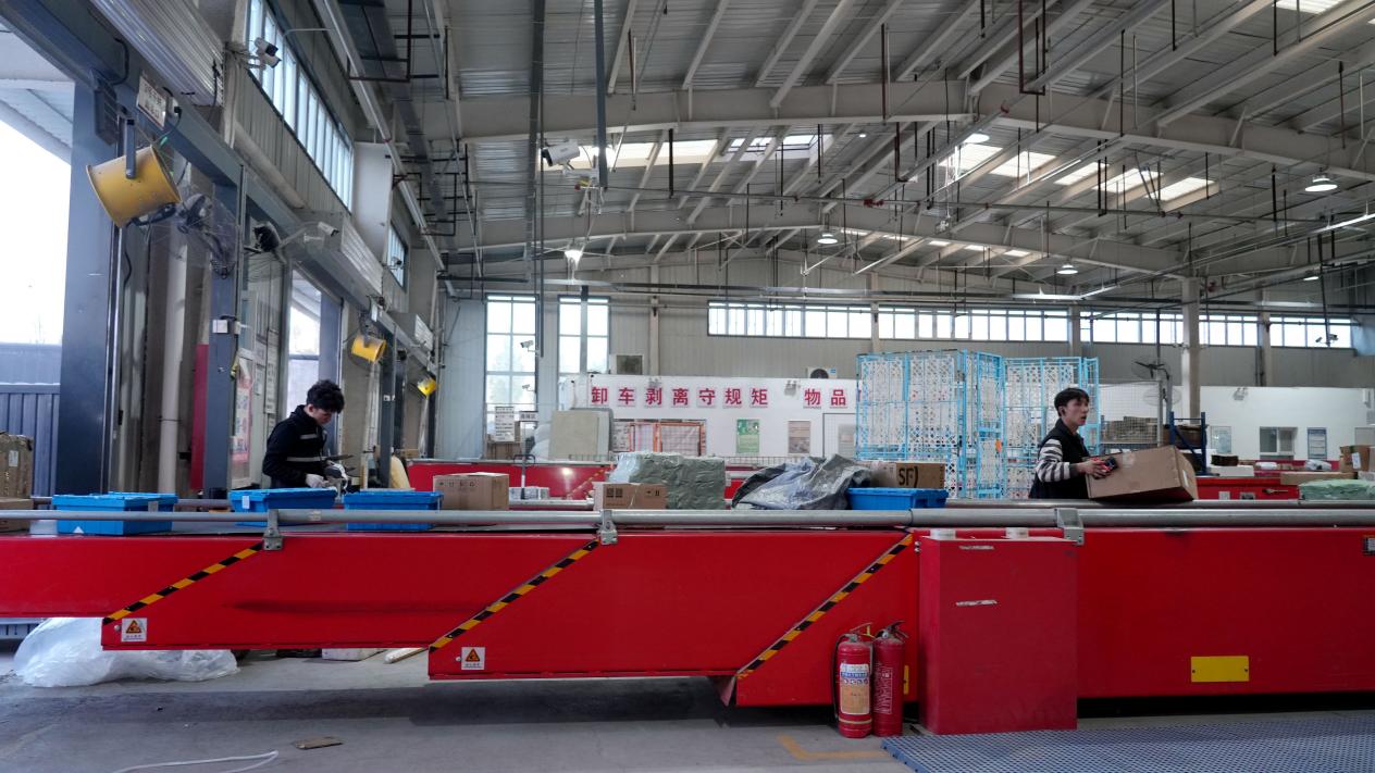 新疆顺丰速运有限公司阿克苏分公司,工人们正在扫码快件。(赵新昌 摄)