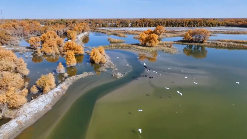 新疆轮台县:胡杨金黄 群鸟竞渡