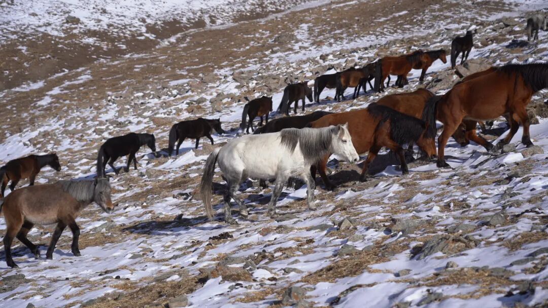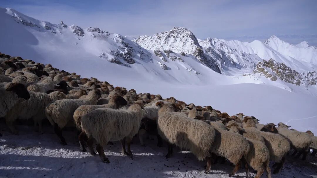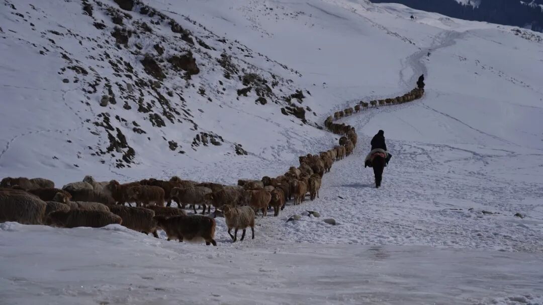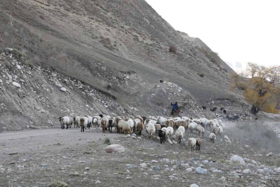 当天清晨时分,牲畜在牧道上有序前行,牧民们牵引牧羊犬引导队伍。拥有20多年转场经验的吾任巴赛・卡可勒,早在半个月前便为体弱的牲畜补充了精饲料,为安全转场做好准备。