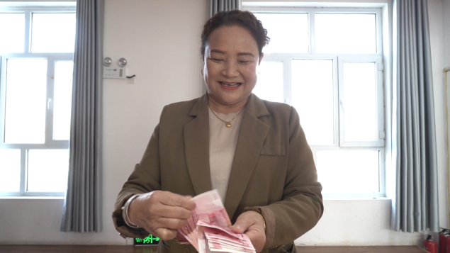 沙湾市安集海镇安集海村家属队组股份经济合作社股民正在开心数钱 常乙 摄