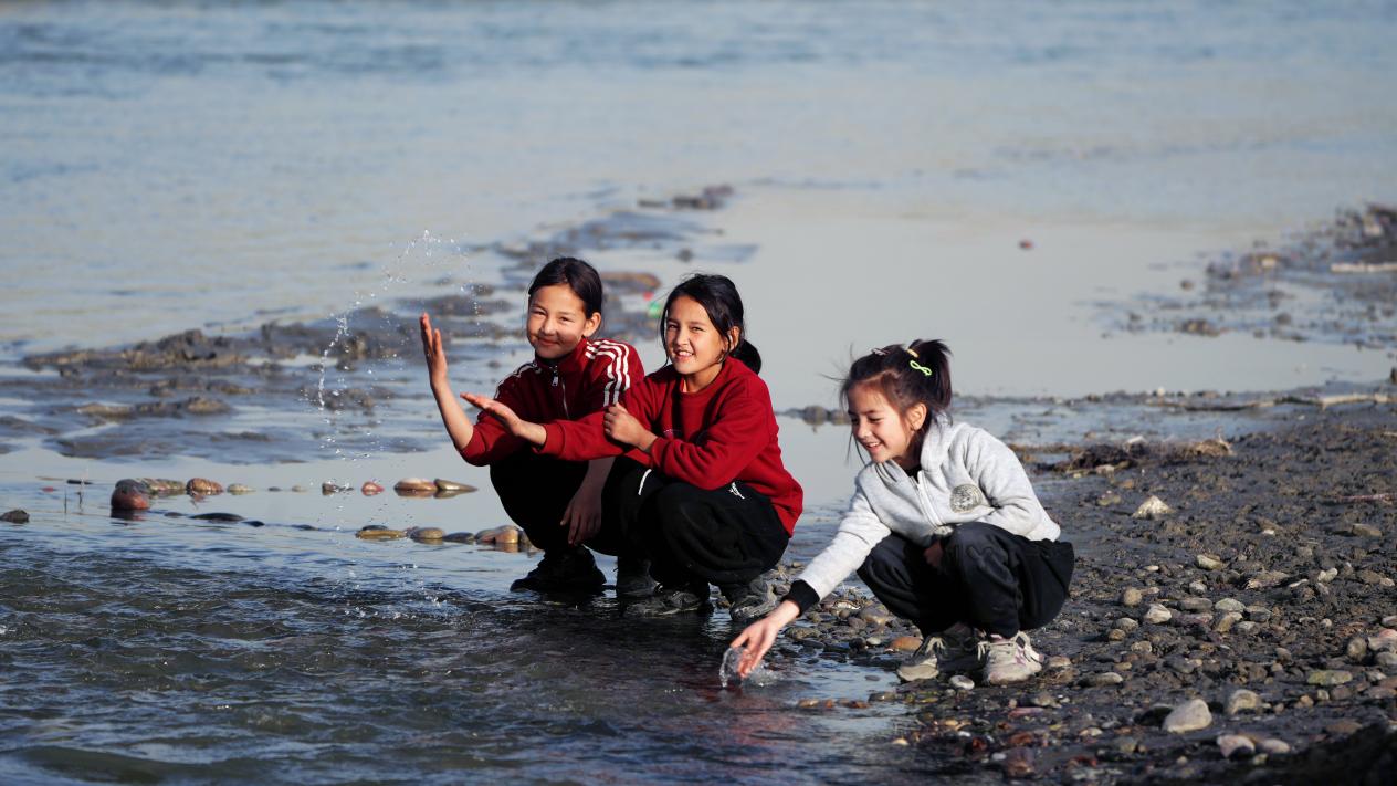 孩子们在温宿县恰格拉克乡喀拉都维村库玛拉克河畔嬉戏玩水(赵新昌 摄)
