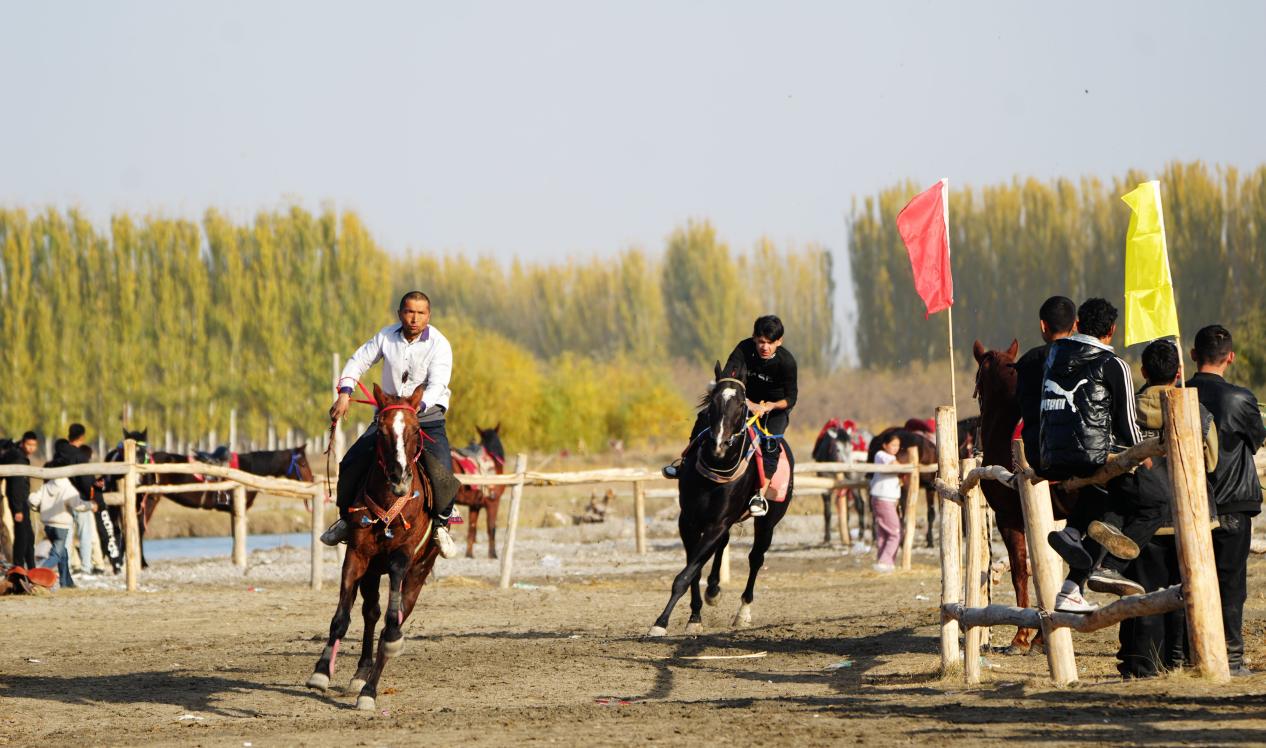 11月1日,在温宿县恰格拉克乡喀拉都维村库托草原上,来自温宿县及周边县市的骑手参加赛马比赛。(赵新昌 摄)