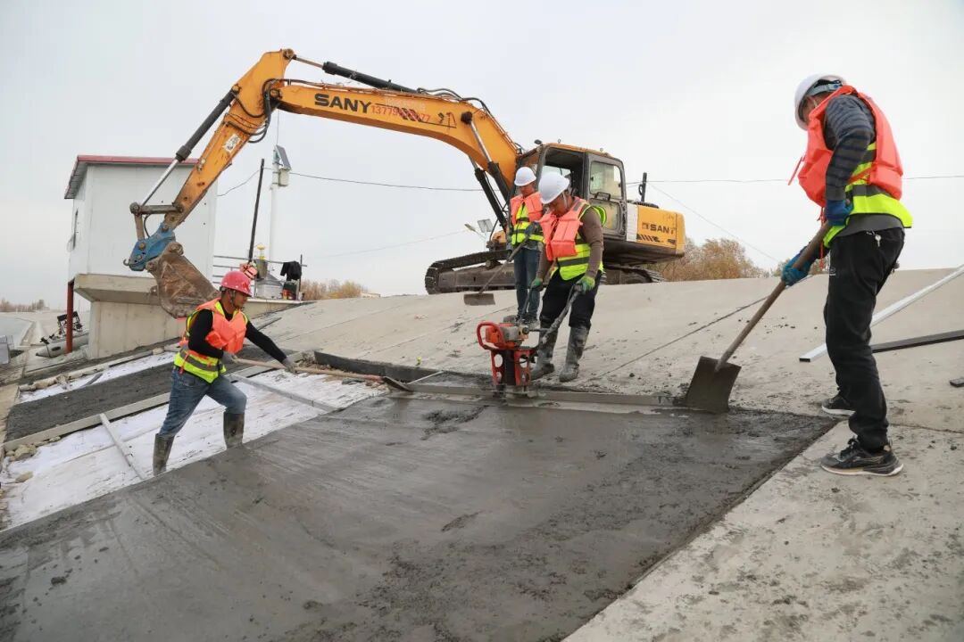 与此同时,六十三团跃进一库维修养护项目正紧锣密鼓推进。眼下,施工技术人员正在进行大坝混凝土面板浇筑作业。该水库始建于1970年,今年四师可克达拉市水利工程管理服务中心对排查发现的安全隐患及时处置,施工人员严格按照规程拆除下沉旧面板,完成夯实换填、铺设土工布及重新浇筑混凝土等工序。