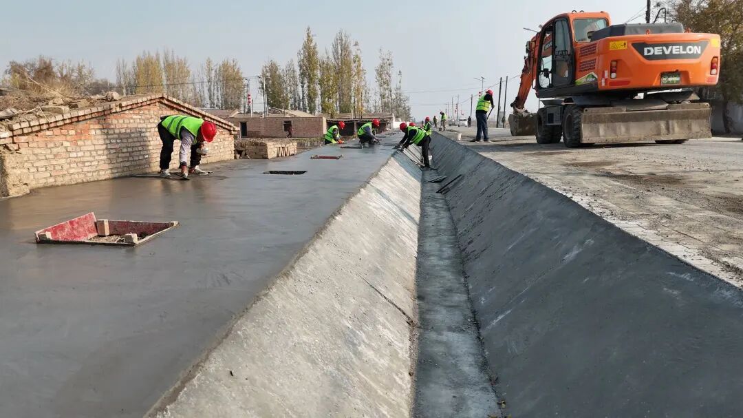 10月30日,在乌兰乌苏镇黄家梁新村北湖组基础设施建设项目现场,挖掘机正在开挖渠道基坑,工人们忙着搅拌混凝土、铺设花砖,各环节作业紧张有序。