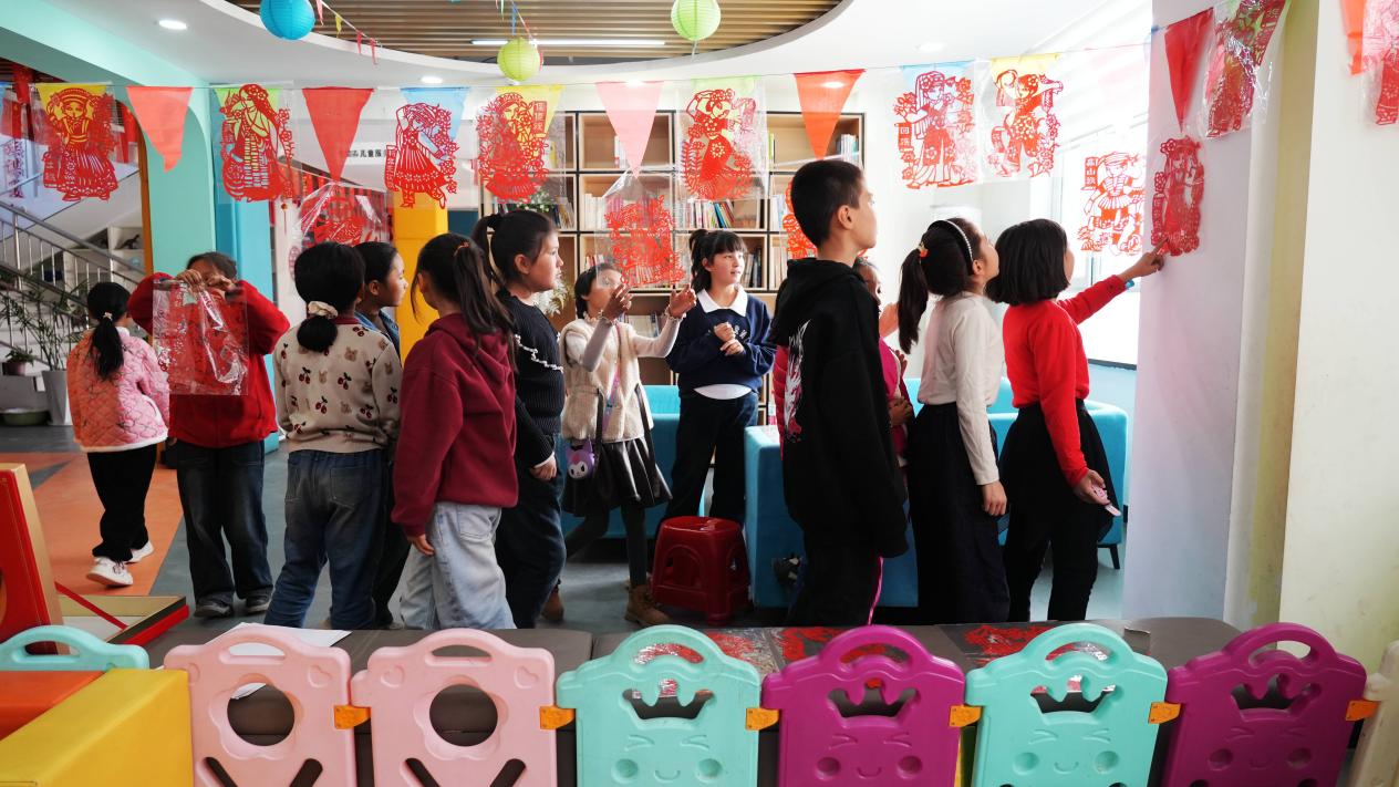 马新枣创作的《五十六个民族》剪纸作品孩子们的热烈欢迎,大家纷纷打卡拍照(赵新昌 摄)