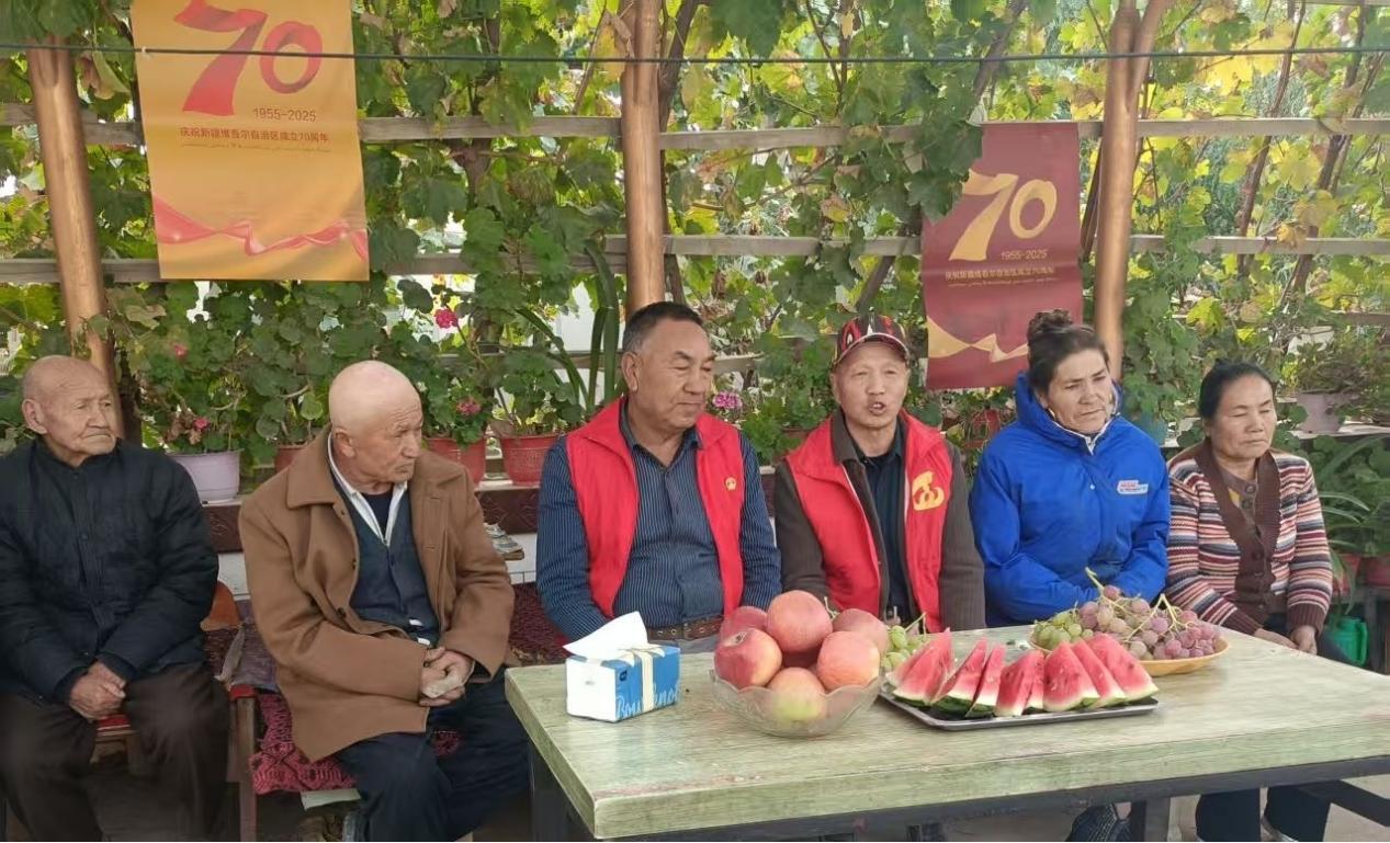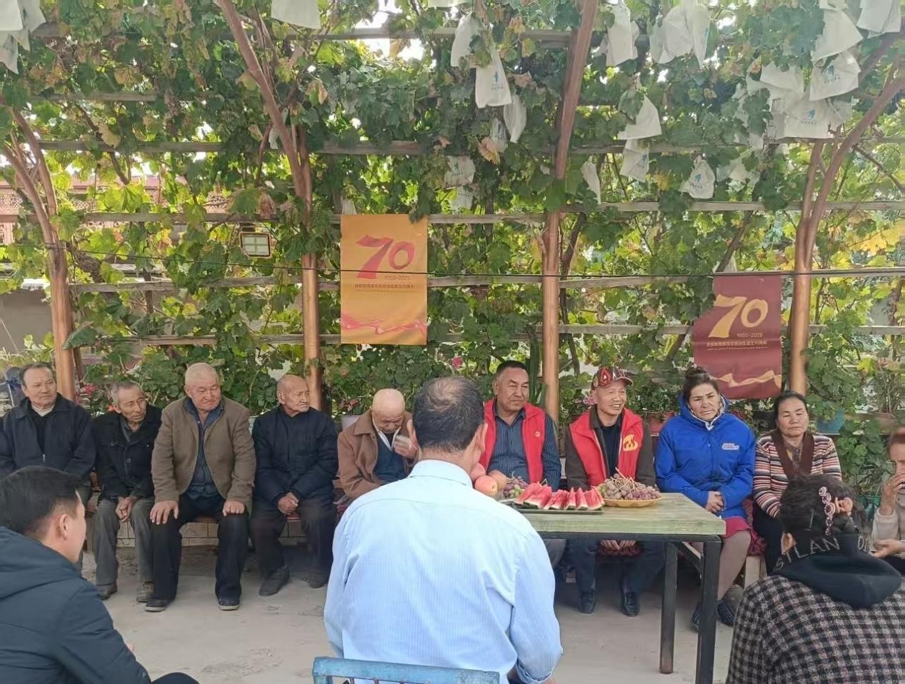 凝心聚力,薪火相传。为让党的二十届四中全会精神及“十五五”规划内容真正“飞入寻常百姓家”,近日,温宿县柯柯牙镇创新宣讲形式,邀请镇人大代表、民族团结先进典型“核桃兄弟”与村民们围坐于枝繁叶茂的葡萄架下,以“拉家常”的方式共学政策精神、共忆奋斗岁月、共话家乡变迁,让理论宣讲既有“高度”更有“温度”。
