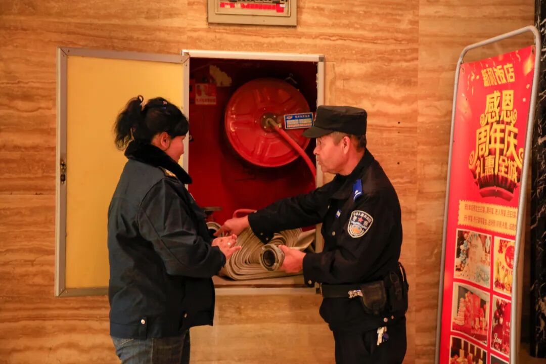 同日,新和镇派出所聚焦人员密集场所,开展消防安全隐患专项检查。在辖区学校,民辅警重点核查疏散通道畅通情况、应急照明及消防器材完好度,询问消防安全制度落实与师生培训情况,叮嘱校方筑牢安全“防火墙”;在酒店、台球厅等场所,通过查阅消防台账、排查电气线路及燃气使用隐患、抽查员工消防知识等方式精准防控,并结合典型案例讲解火灾报警、初期扑救及逃生技巧,强化负责人与员工防范意识。