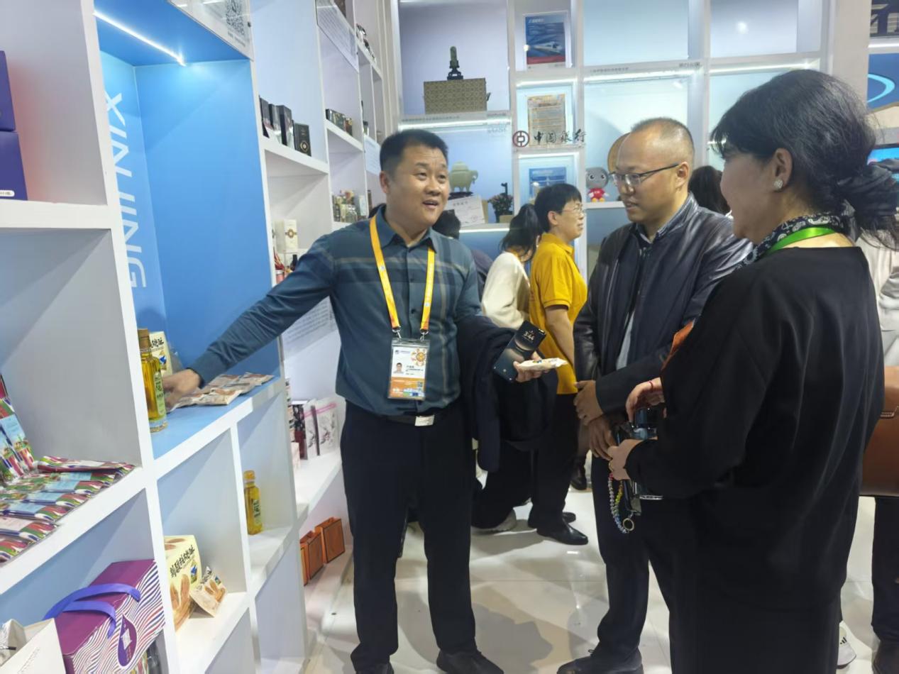 在刚落幕的第八届中国国际进口博览会上,新疆仁核食品有限公司总经理许张忠向参展商和消费者介绍公司产品(张雅琴 摄)
