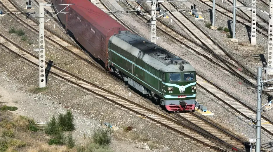 (霍尔果斯铁路口岸一辆编组完成的中欧班列缓缓驶向哈萨克斯坦)