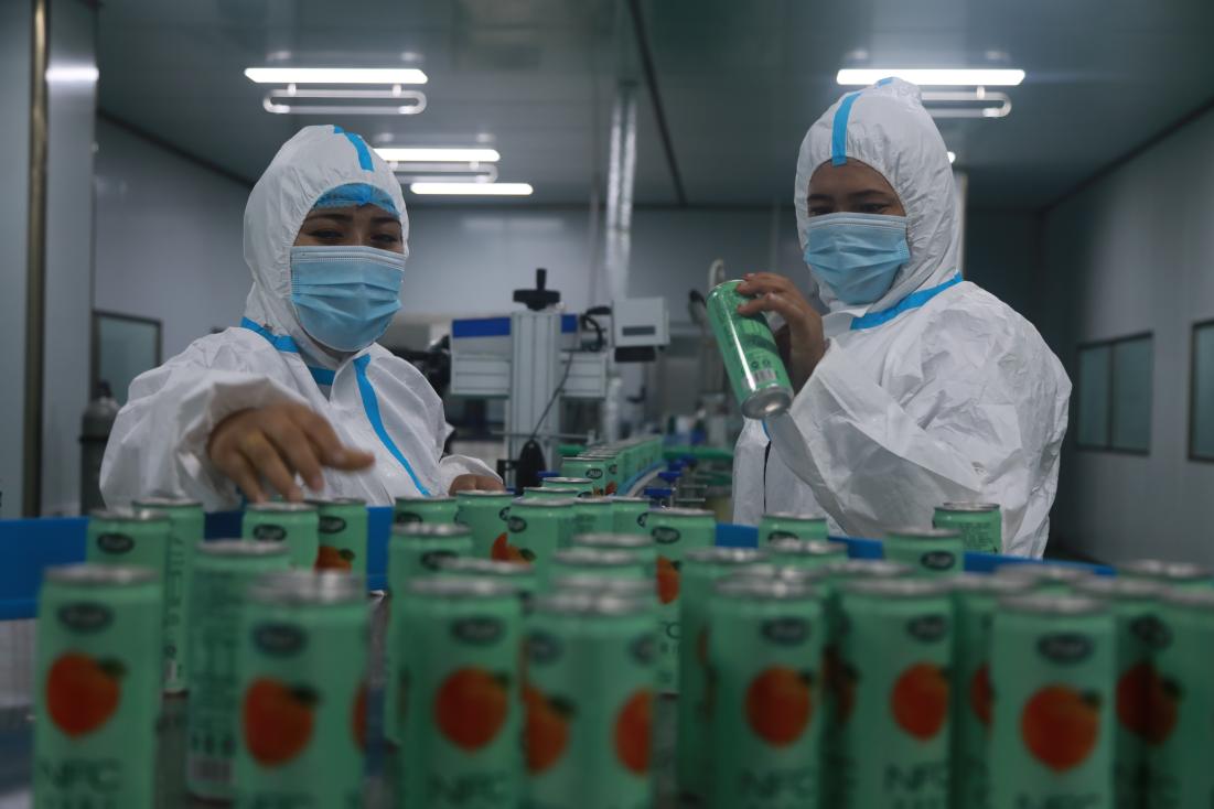 工人在新疆天山果园果业有限公司检查苹果醋的密封质量。石继良 摄