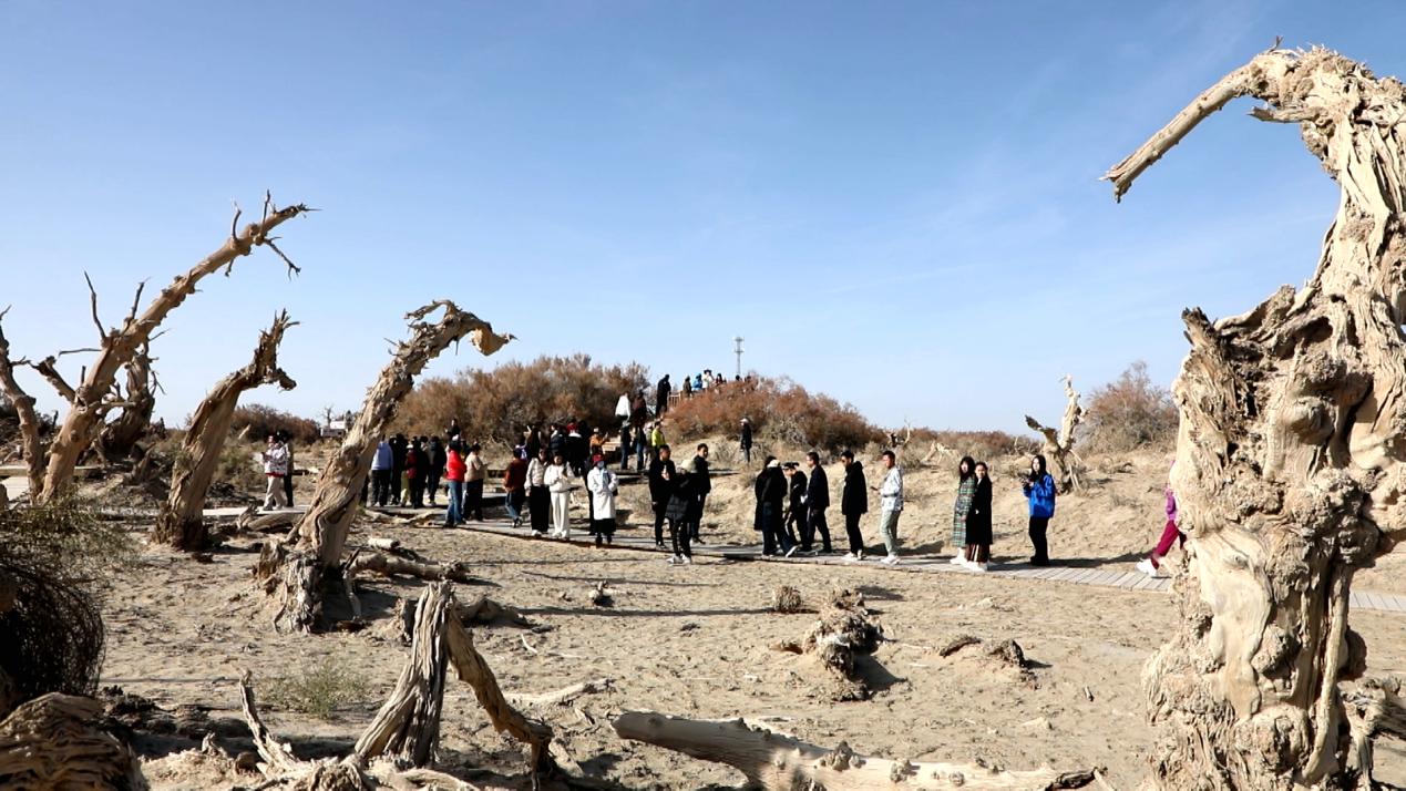 睡胡杨谷景区形态奇特的胡杨让考察团成员感受到阿拉尔生态旅游的独特魅力。胡彩艳 摄