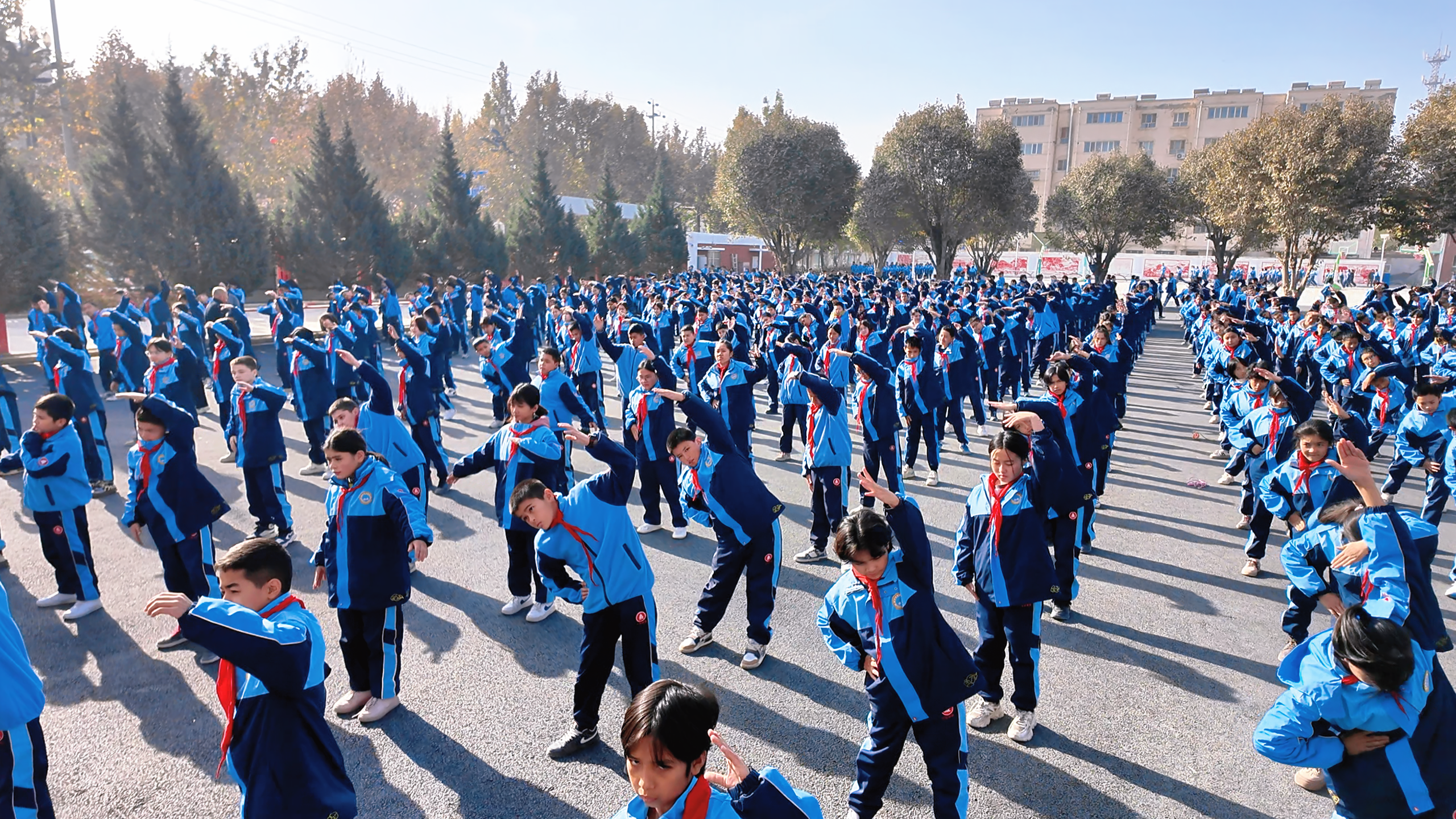 当日上午,墨玉县第二中学校园内,课间操音乐响起。学生们身着天蓝色上衣、黑色运动裤的新校服,在操场列队站齐。随着节拍抬手、弯腰、转身,动作整齐划一,袖口的纹样跟着晃动,成了校园里一道整齐的风景。