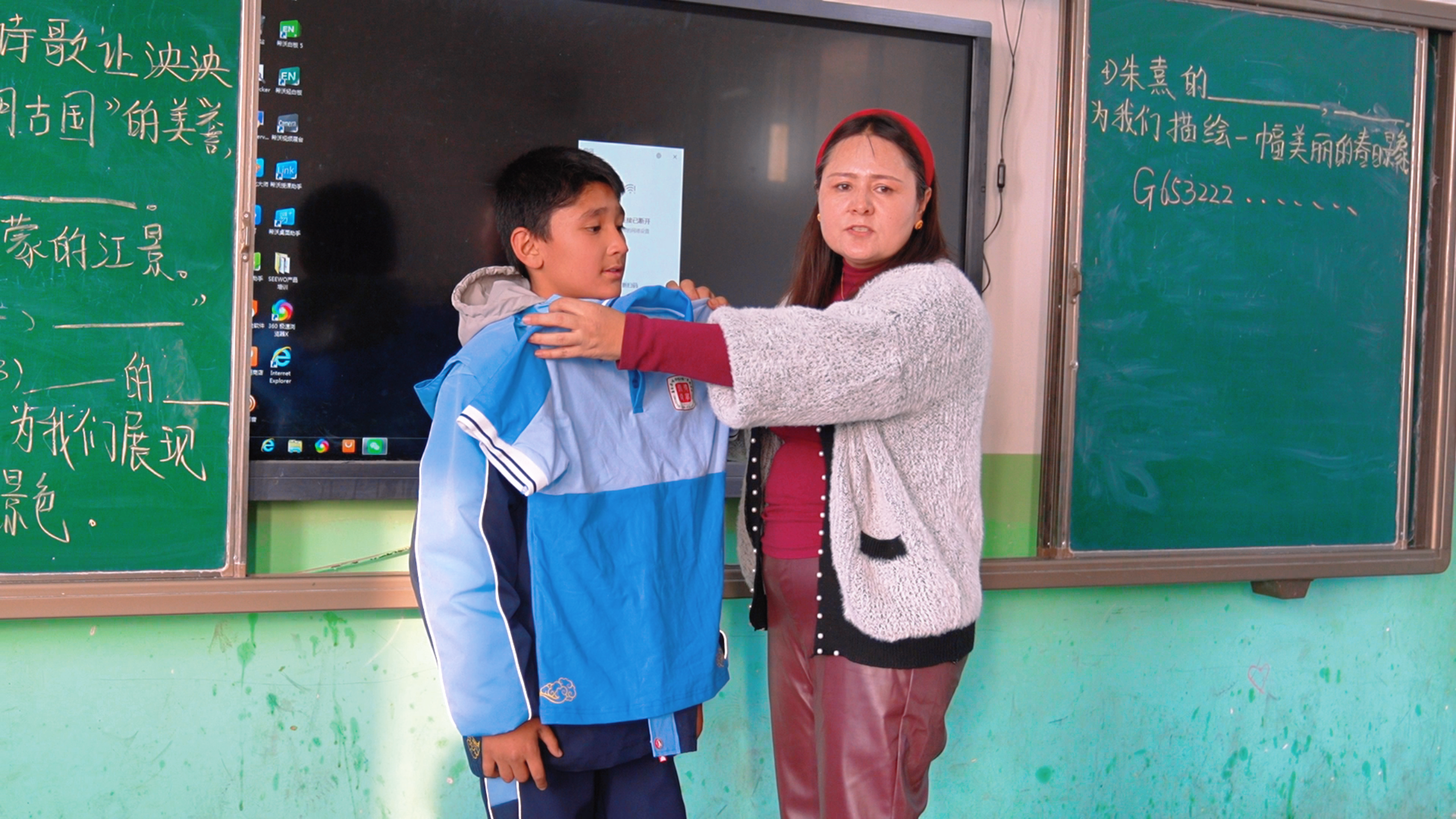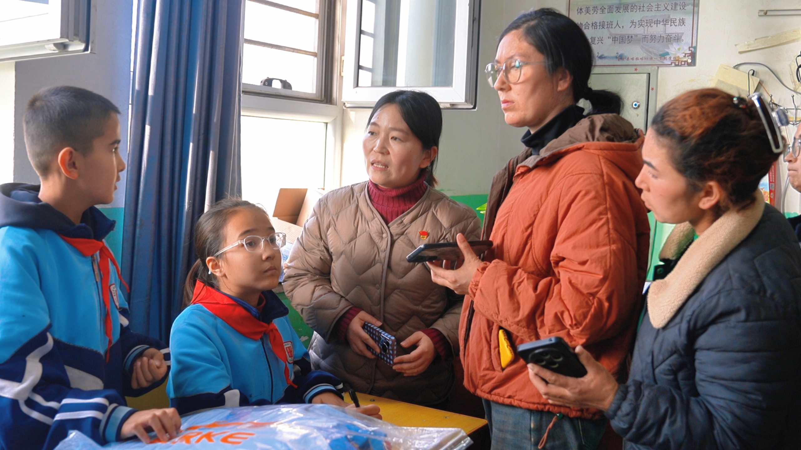 与此同时,墨玉县第四中学小学部的教室里,教师们正逐一向家长讲解校服的面料、尺寸适配技巧,家长们则看着校服,脸上满是认可。墨玉县第四中学还专门成立了由教师、家长、学生代表组成的专项领导小组,从校服款式投票选择、样品质量验收,到最终发放登记签字,每个环节都有三方共同监督,确保公开透明。