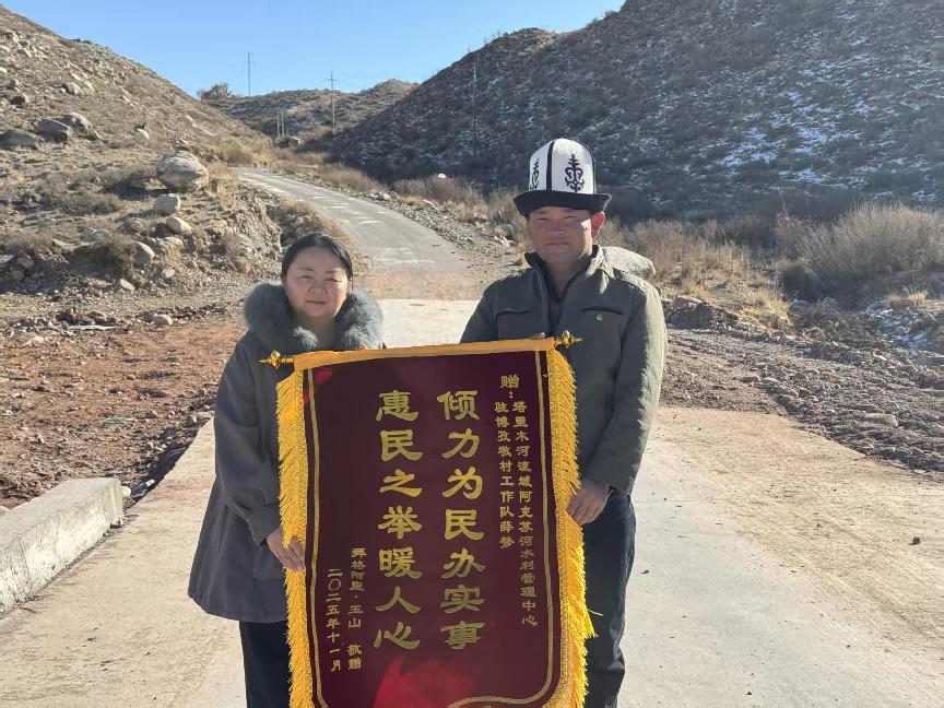 “以前老人突发疾病,救护车都难进村;现在路通了,就医难题彻底解决!”拜格阿里・玉山的感慨道出村民心声。为表谢意,村民代表将写有“倾力为民办实事 惠民之举暖人心”的锦旗送到工作队手中,成为干群同心的生动见证。