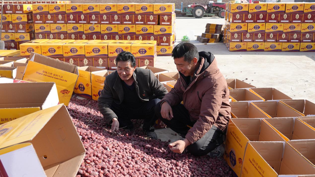 任文超与种植户一起忙着采收红枣(李亚楠 摄)