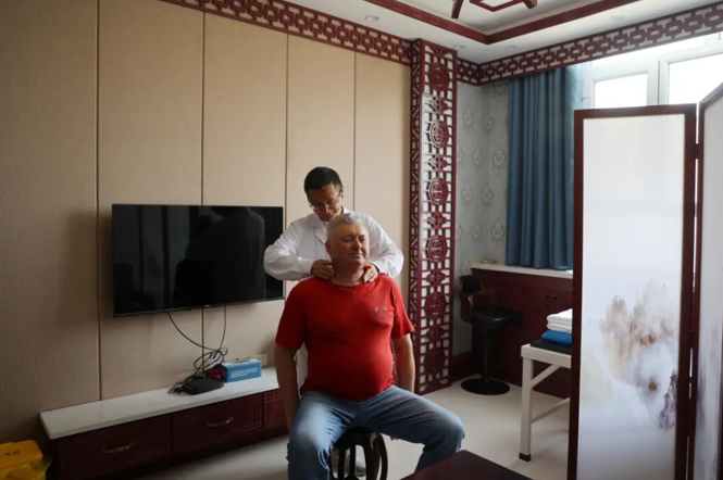 刘国豪正在为外籍患者推拿。阿拉山口市融媒体中心供图