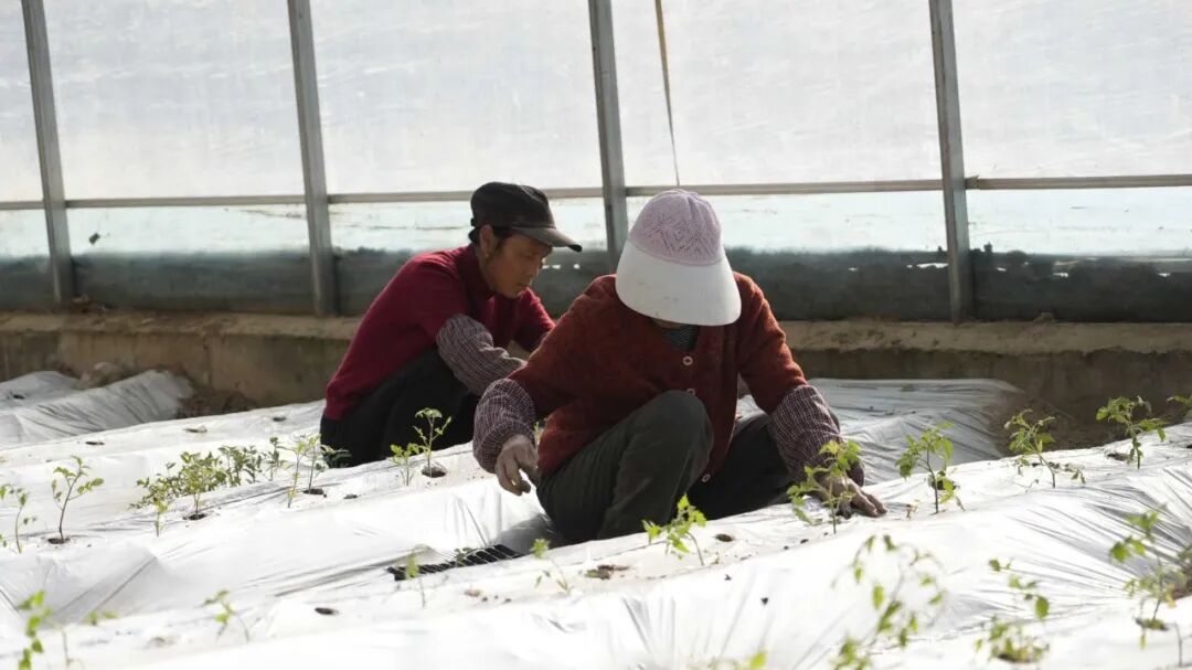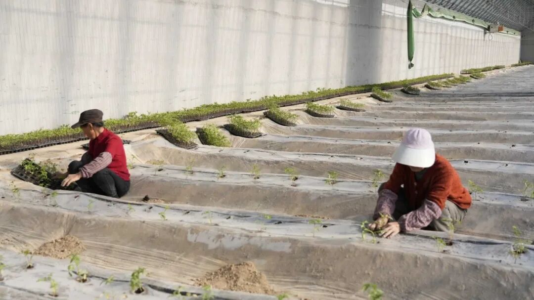 走进种植户董社花的蔬菜大棚,一股夹杂着泥土与幼苗的清新气息扑面而来。工人们正在移栽西红柿苗,挖坑、定苗、覆土压实,整套动作如行云流水。今年她种的是“粉冠”品种反季节西红柿,预计春节期间集中上市。