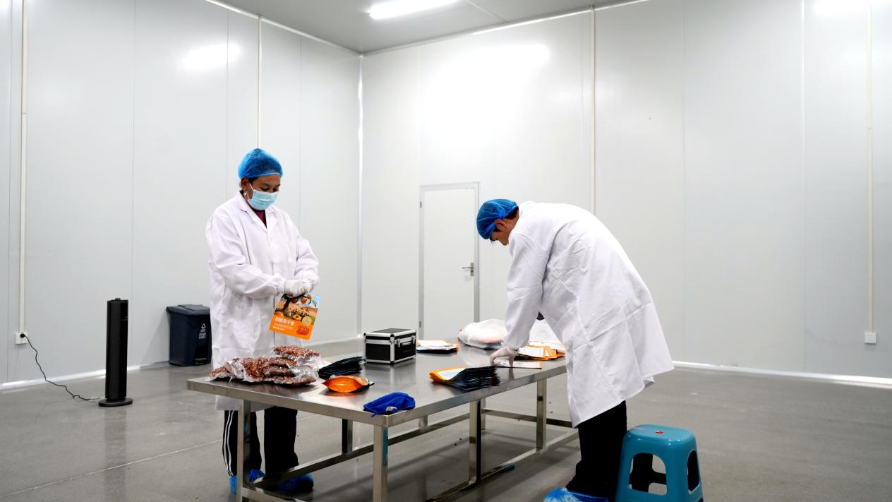在阿克苏禧洋食品科技有限公司的产品包装车间,工作人员正在封装核桃、吊干杏等产品(赵新昌 摄)