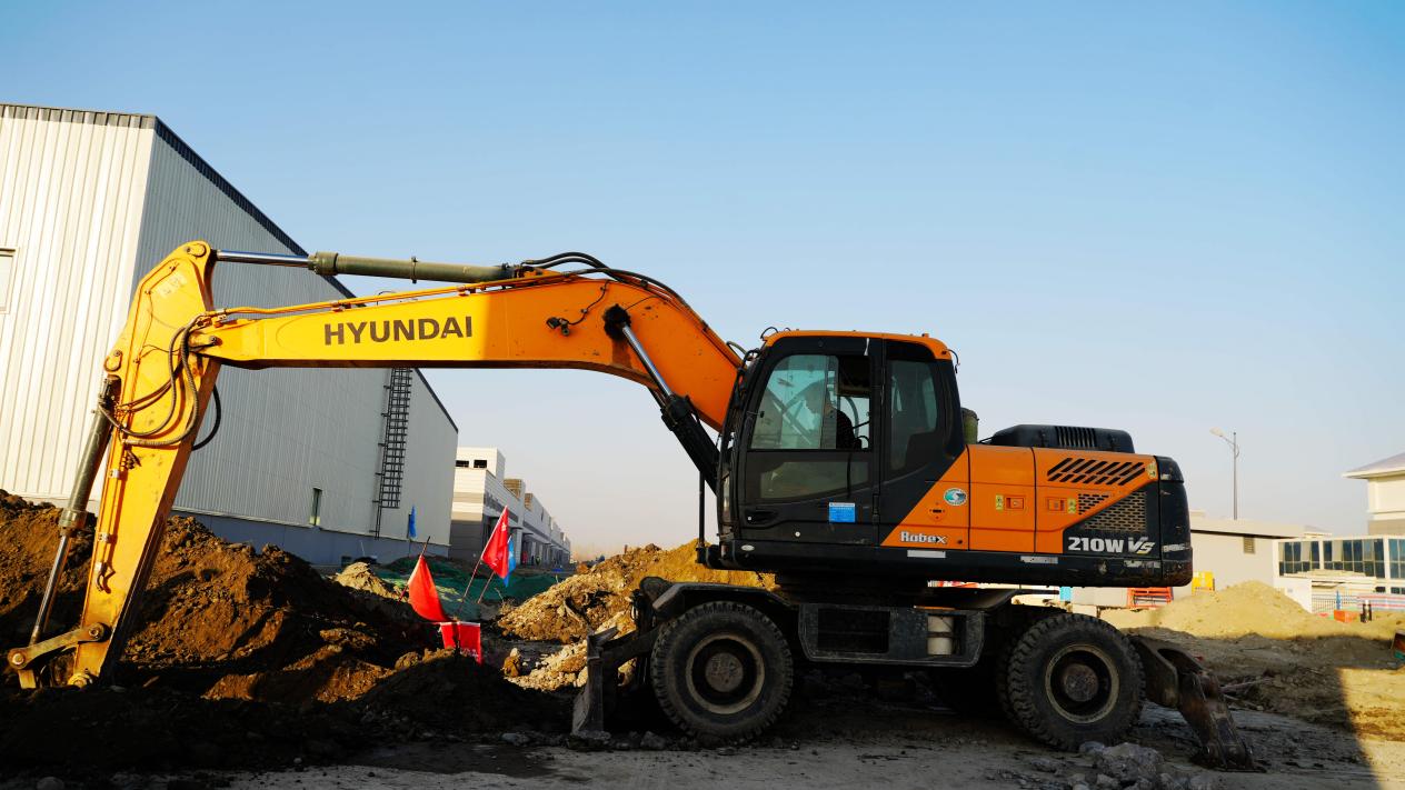 在温宿新投纺织科技有限公司100万锭棉纺项目工地,工人驾驶挖掘机进行作业(赵新昌 摄)