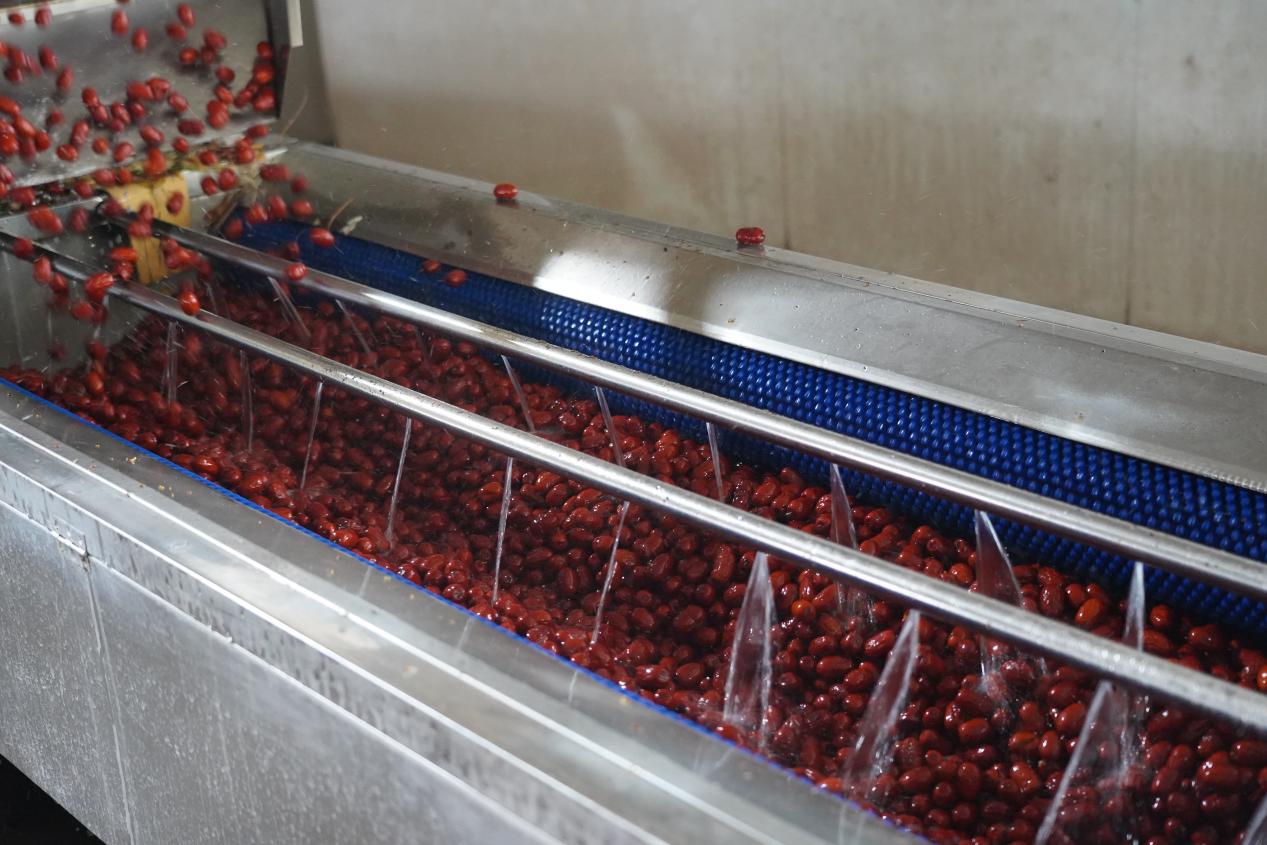 车间内的红枣加工线正在进行红枣清洗作业(张卓凡 摄)
