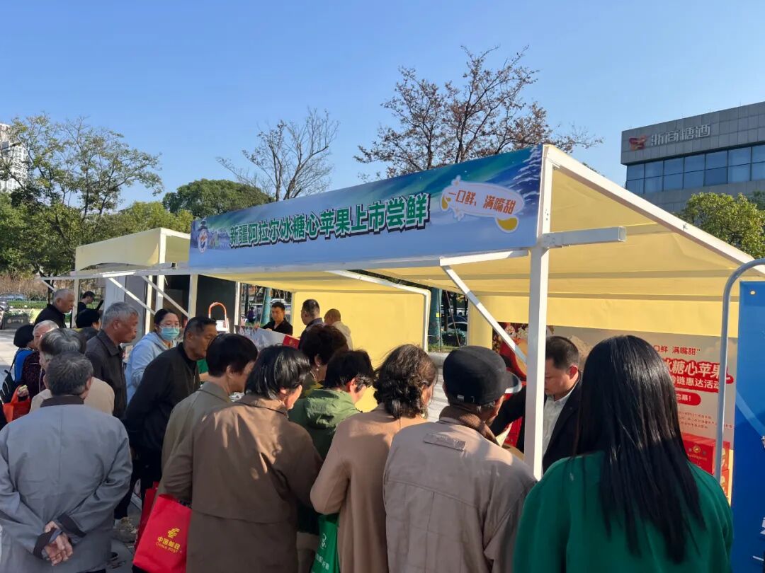 “一口鲜·满嘴甜——新疆阿拉尔苹果上市尝鲜季冷链惠达”活动现场,新疆特色农副产品吸引了众多台州市民选购。卿朋 摄